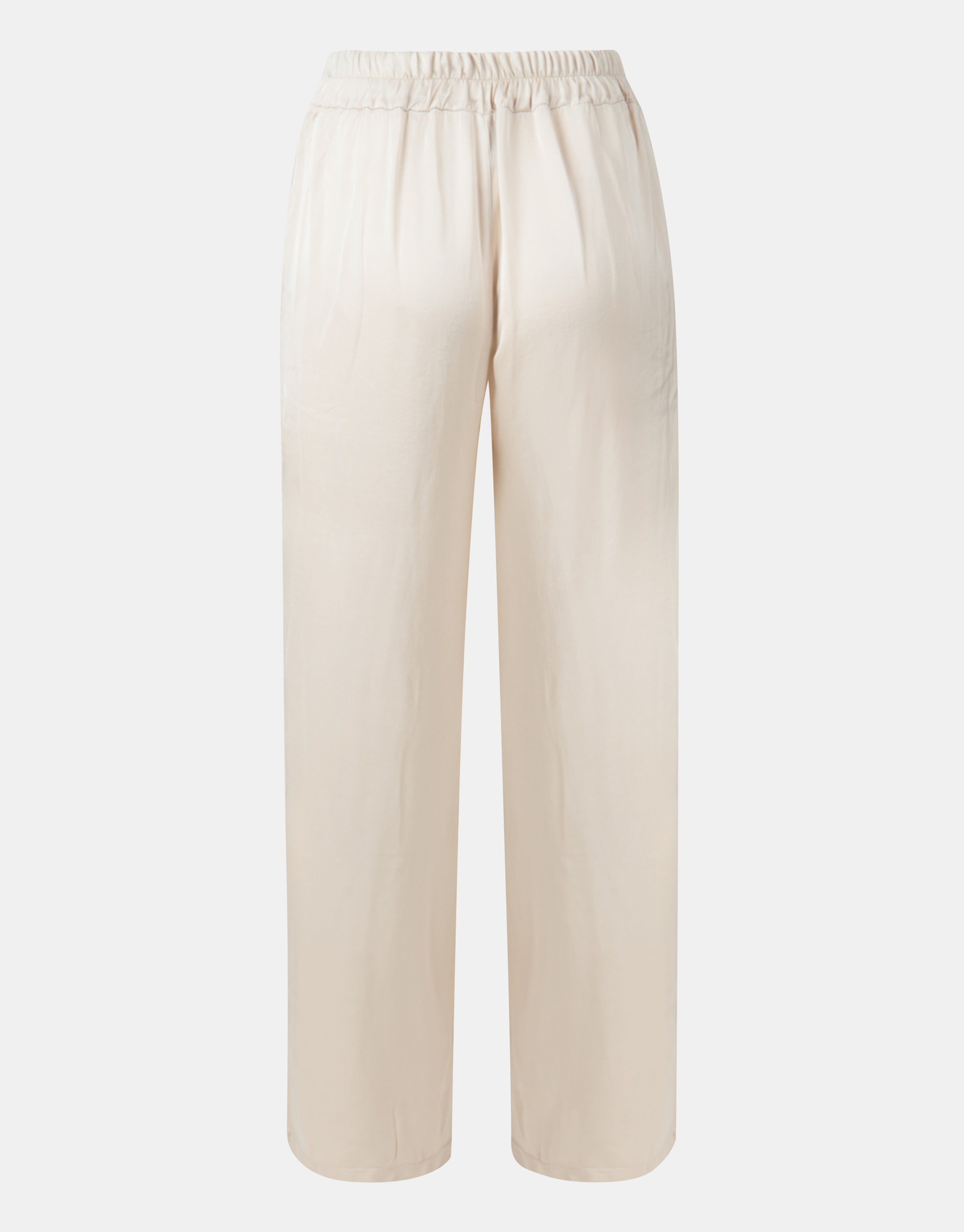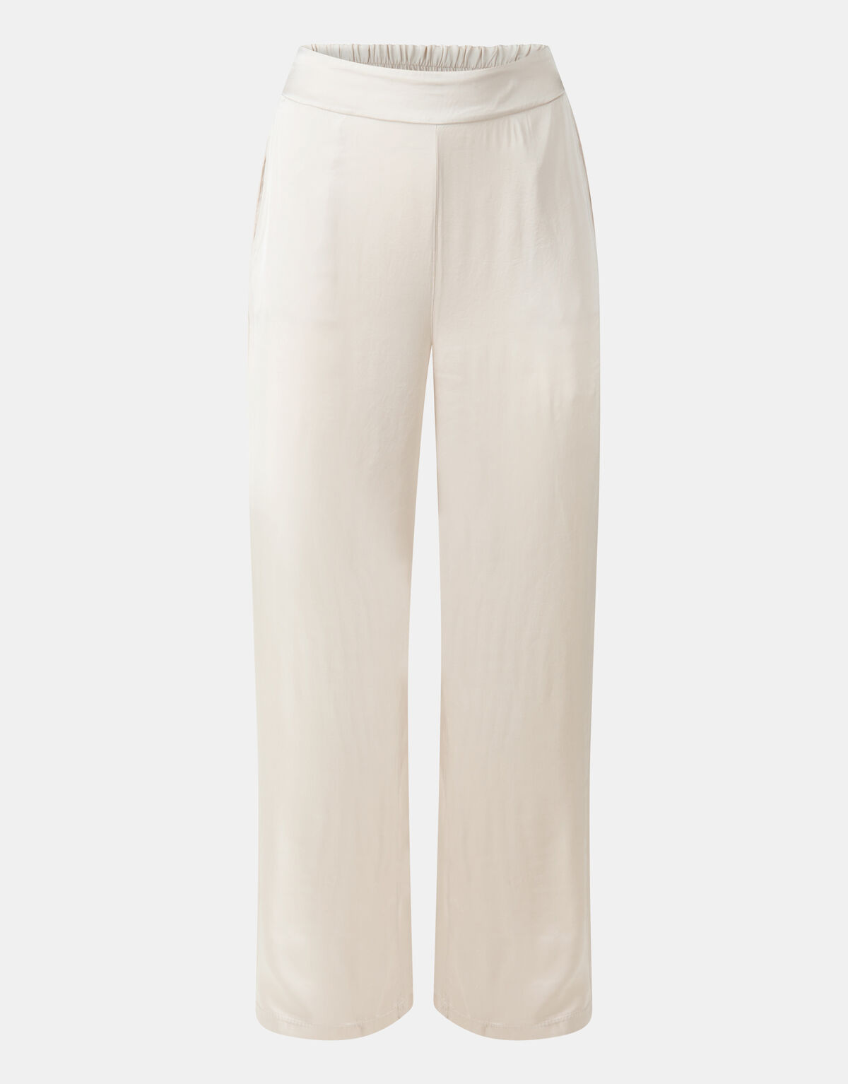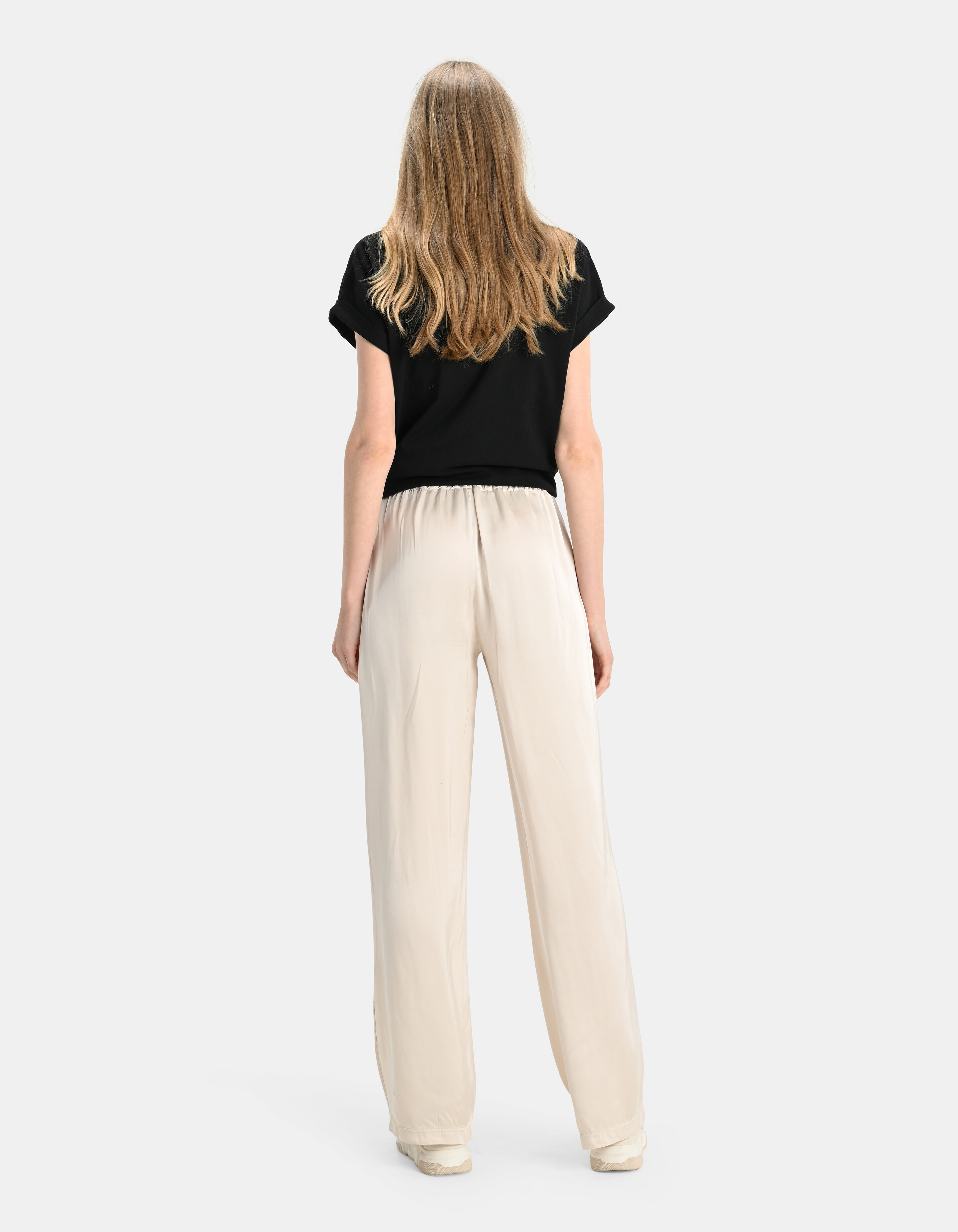 Trend-Alarm! Die Satin Pants hat eine lockere Passform, einen elastischen Bund, eine hohe Taille und Seitentaschen. Der Artikel zeichnet sich durch eine beige Sandfarbe und die Satinoptik aus. Kombiniere die Hose zusammen mit einem Statement-T-Shirt und Sneakers für einen coolen Look! Das Modell hat eine Länge von 180 cm und trägt Größe S. Der Artikel hat bei Größe S eine Innennaht von 82 cm.