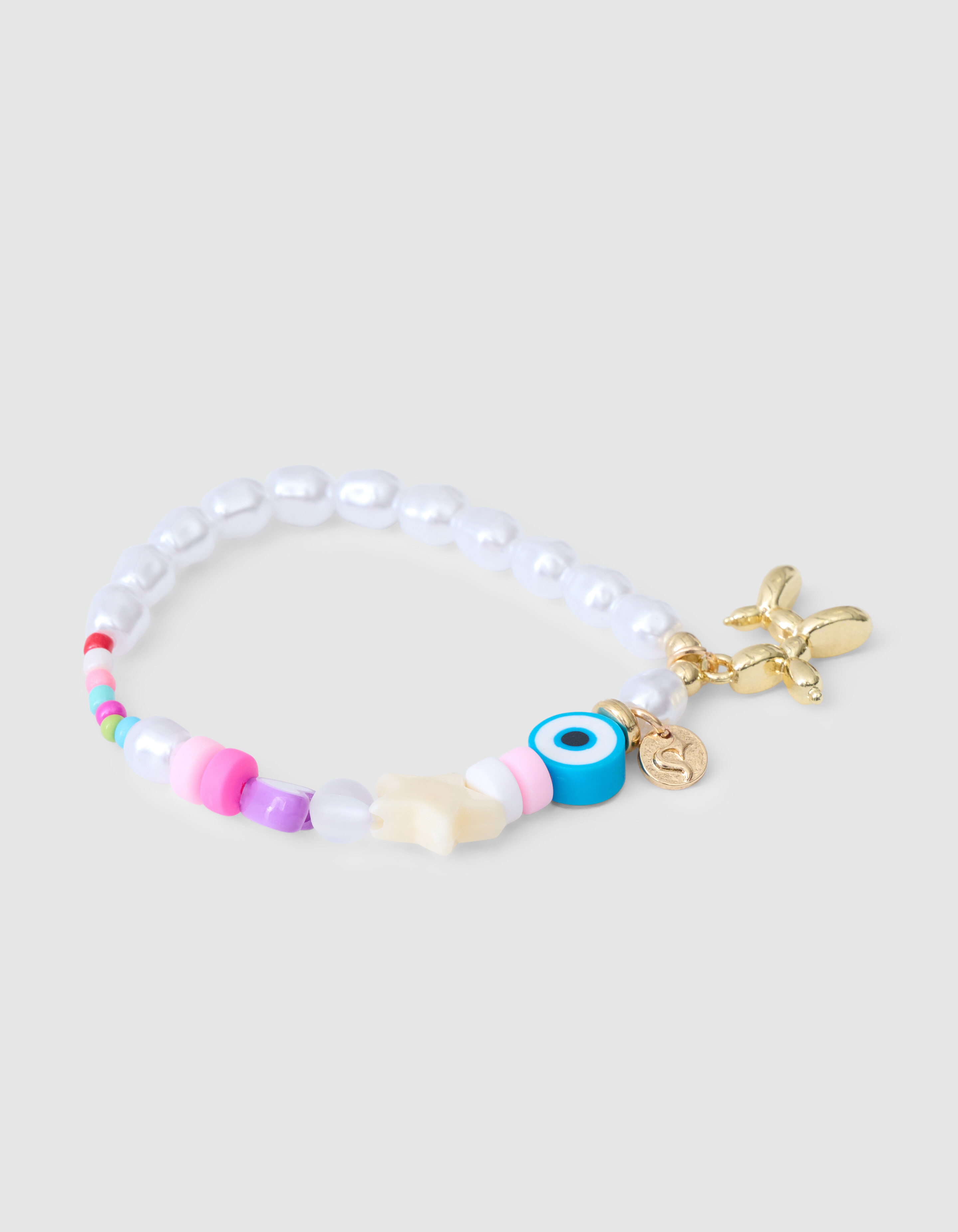 Muss man haben! Mit seiner schönen Farbpalette ist dieses Armband eine subtile Ergänzung für jedes Outfit. Das Armband besteht aus weißen Perlen, bunten Anhängern und goldenen Details.