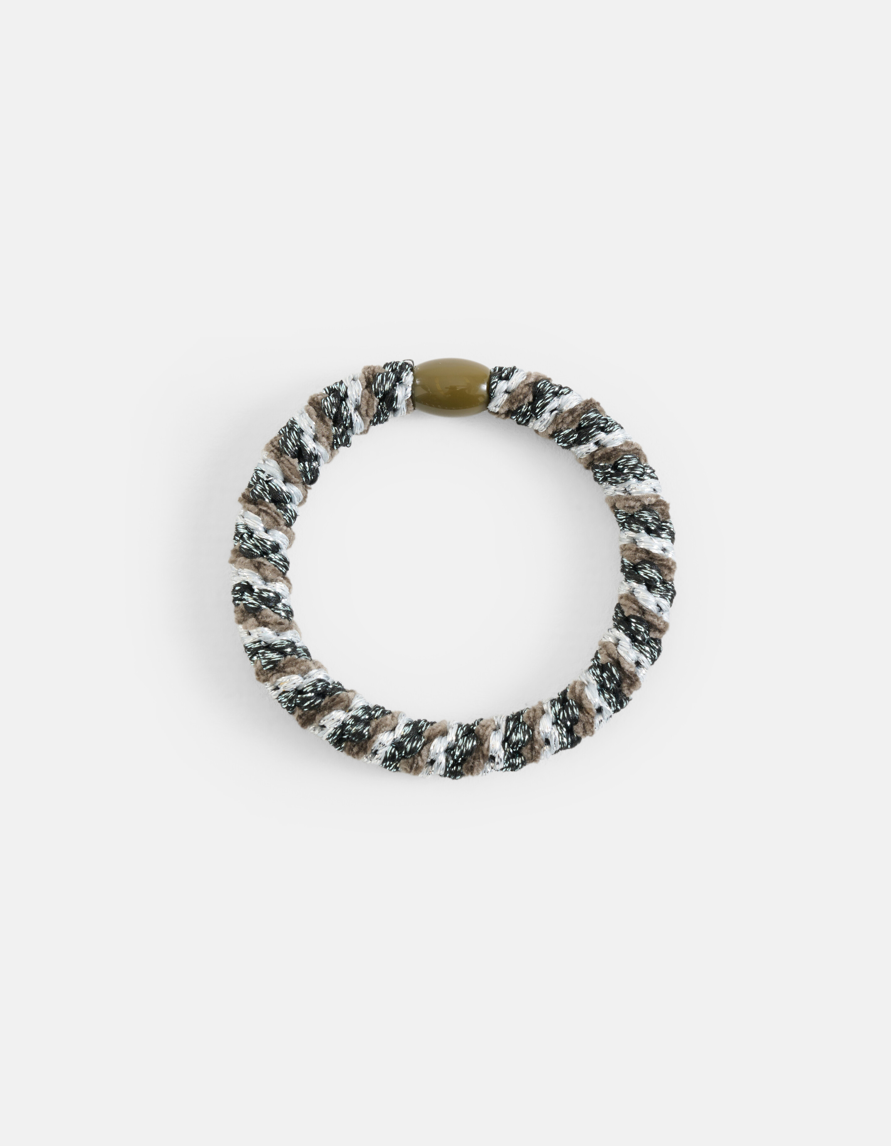 Entworfen, um Sie zum Strahlen zu bringen! Vervollständigen Sie Ihren Haar-Look mit diesem niedlichen Haargummi. Der Artikel zeichnet sich durch seine graue Farbe mit schwarzen, dunkelgrauen und dunkelgrünen Details aus. Außerdem ist das Gummiband mit Samtstoff und einem silberfarbenen Lurexfaden durchzogen. Ein echter Hingucker! Lustig am Arm als Armband oder im Haar!