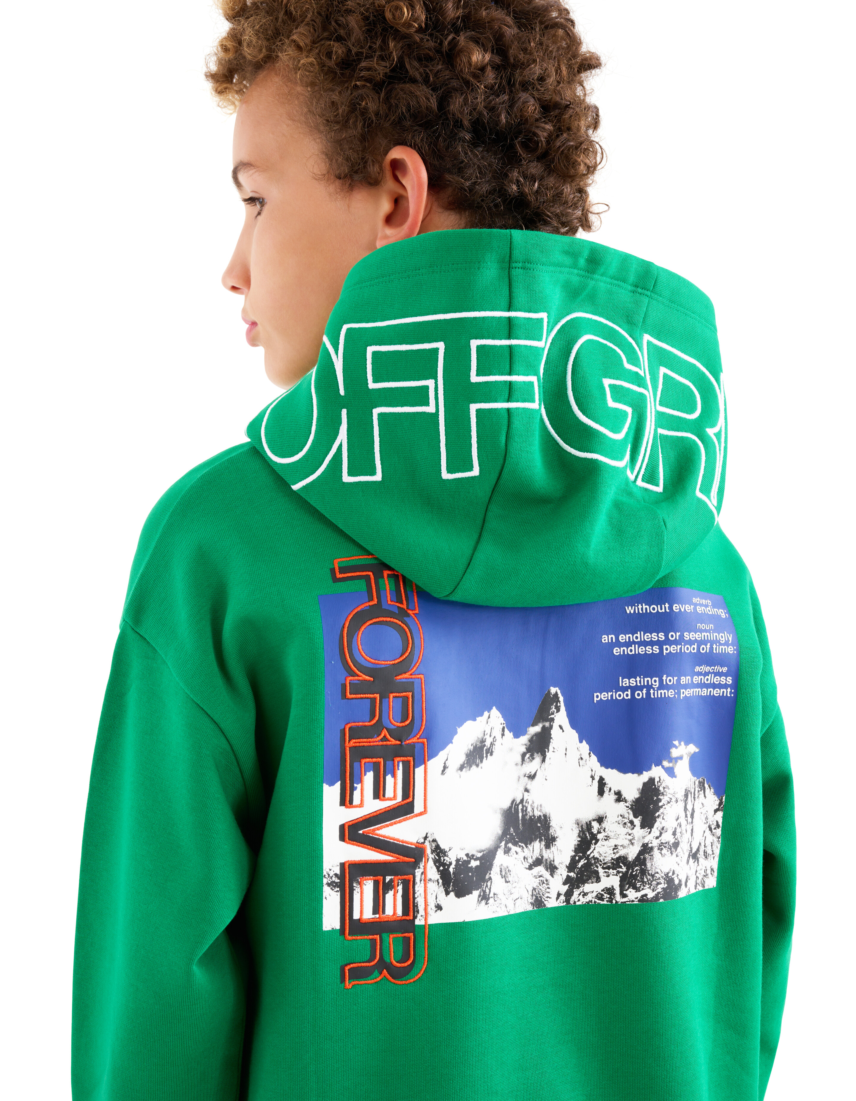 Von der Natur inspirierte Mode für Outdoor-Fans! Der Artwork Hoodie hat lange Ärmel, eine Kapuze, einen dehnbaren Stoff, eingesetzte Taschen und eine lockere Passform. Der Artikel zeichnet sich durch seine trendige grüne Farbe mit einem Fotodruck und einer Stickerei auf dem Rücken aus. Die Kapuze ist mit dem gestickten Schriftzug "off the grid" und einem orangefarbenen Shoeby-Glitzerlogo versehen, was für einen coolen Effekt sorgt! Die gebürstete Innenseite macht den Hoodie warm und weich. Kombinieren Sie ihn mit einer Cargohose für einen abenteuerlichen Look!