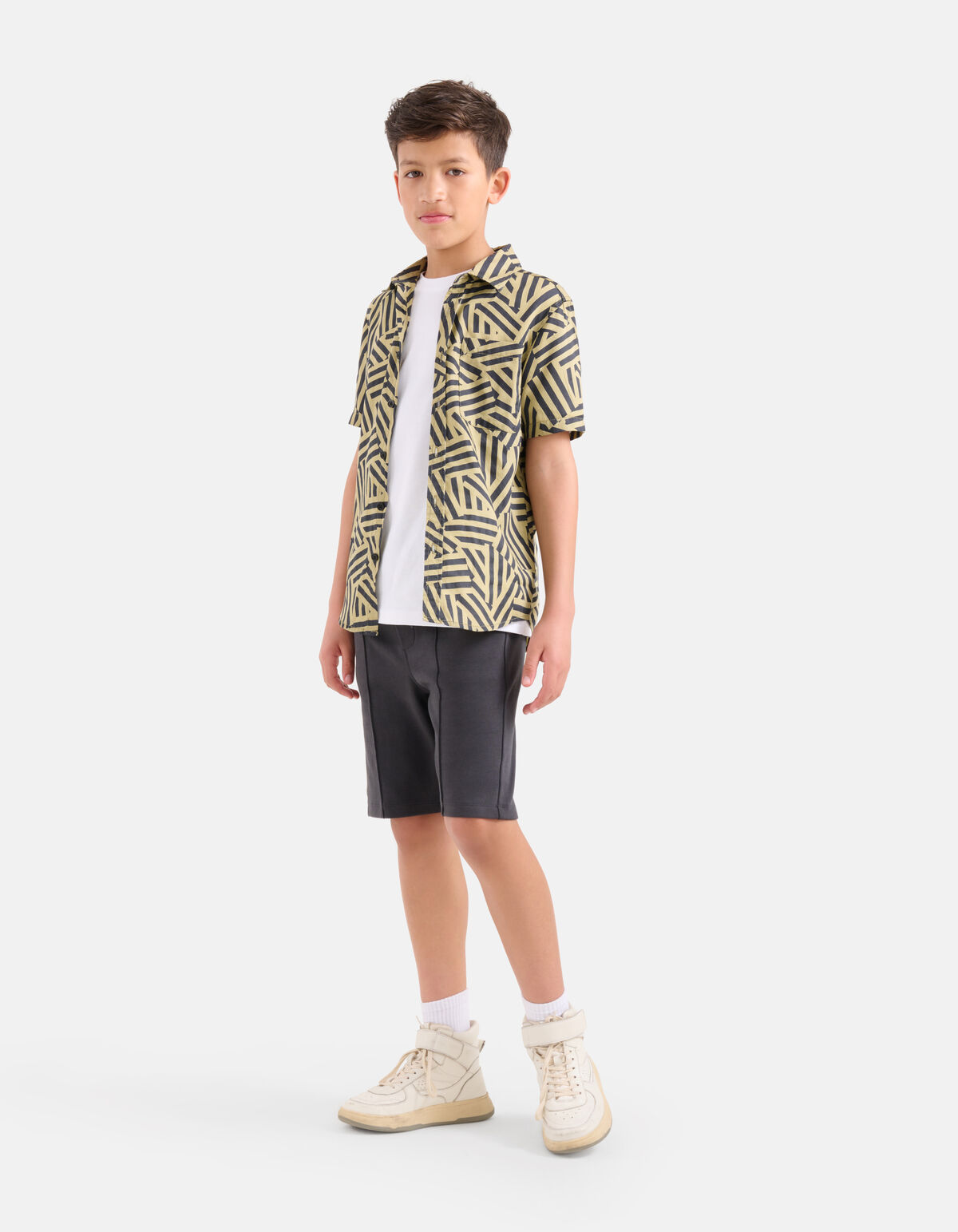 Bedrucken Sie es! Geometrisches Hemd mit kurzen Ärmeln, einem Kragen, einem Knopfverschluss und einer Vordertasche. Der Artikel zeichnet sich durch seine Sandfarbe mit einem geometrischen Allover-Druck in der Farbe Schwarz aus. Es besteht aus 100 % leichter Baumwolle und ist daher von hoher Qualität, atmungsaktiv und angenehm zu tragen. Vervollständigen Sie den Look mit einem Basic-T-Shirt und Shorts für einen Lagenlook!