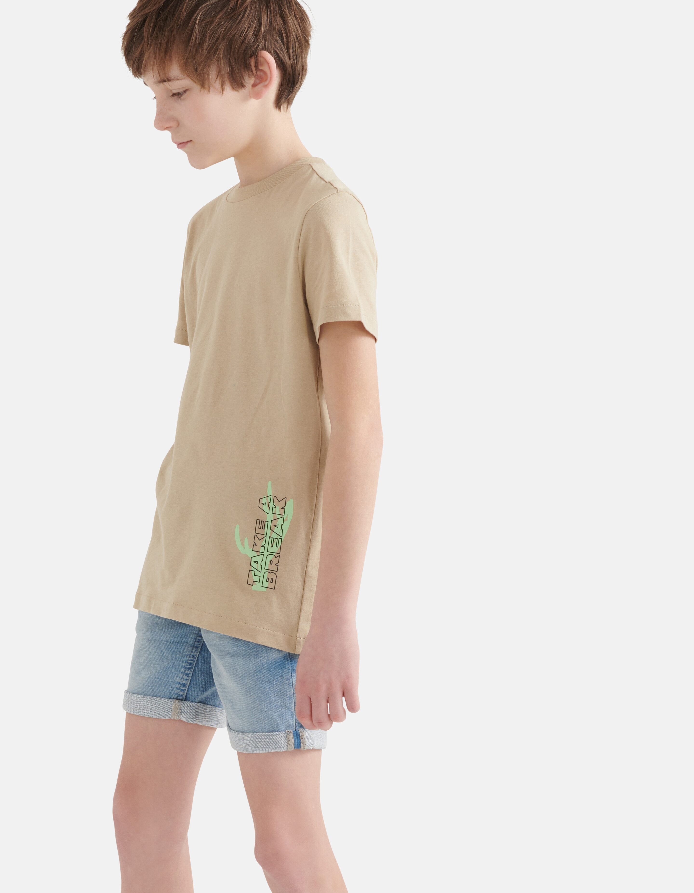 Mach eine Pause! Das Artwork T-Shirt hat kurze Ärmel, einen hohen Rundhalsausschnitt und eine normale Passform. Der Artikel zeichnet sich durch die beige Farbe mit einem Pigmentdruck auf der Vorderseite und einem Platisol- und High-Density-Druck auf der Rückseite aus. Diese Drucke verleihen dem T-Shirt einen einzigartigen Effekt! Es besteht aus 100 % Baumwolle und ist daher von hoher Qualität und angenehm zu tragen. Vervollständigen Sie den Look mit einer Jeansshorts und Sie sind bereit für den Tag!