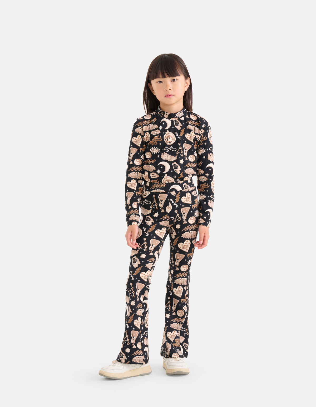 Die perfekte Mischung aus Funktionalität und Mode! Die Printed Flared Trousers hat eine hohe Taille, einen Stretch-Stoff, einen ausgestellten Schnitt und einen elastischen Bund. Der Artikel zeichnet sich durch die schwarze Farbe mit einem grafischen Allover-Print aus. Der Druck zeigt verschiedene flippige Prints in einer braunen Farbe. Die Hose ist aus Polyester und Elastan gefertigt. Diese Zusammensetzung macht sie stark in der Qualität, formstabil und dezent dehnbar. Vervollständigen Sie den Look mit dem passenden bedruckten Oberteil und einer Teddy-Weste für einen stilvollen Look!