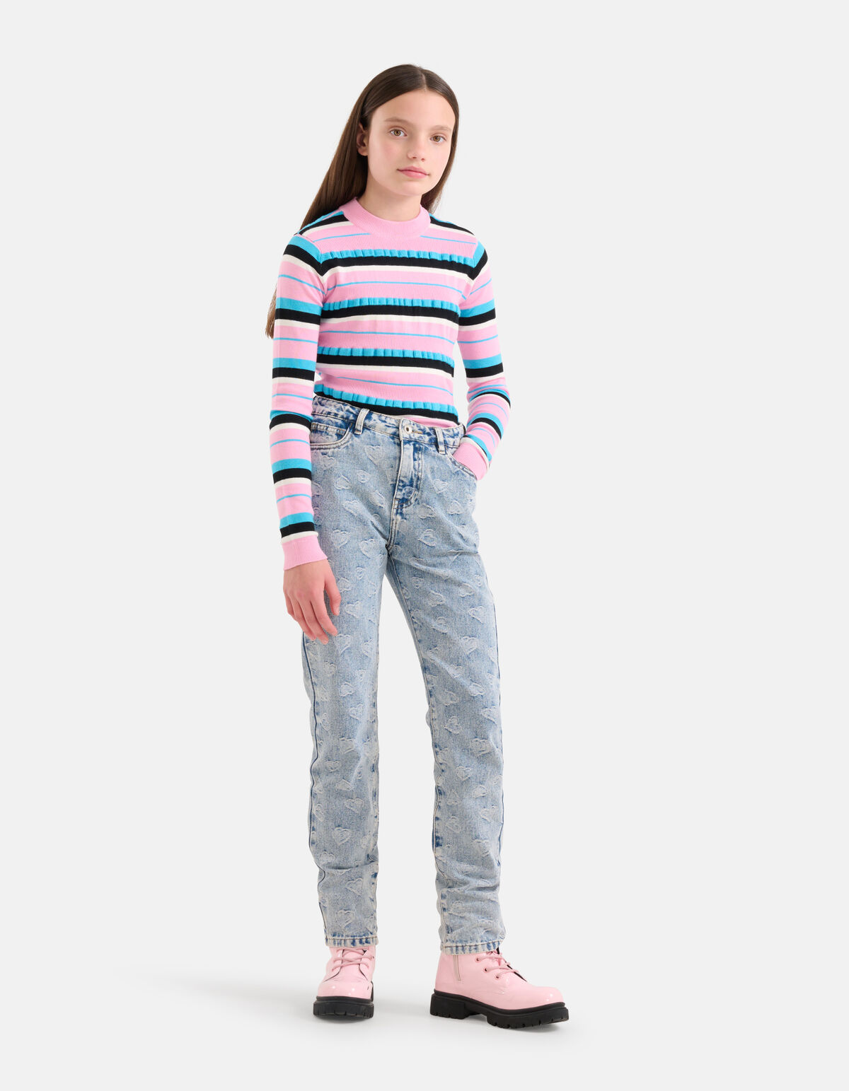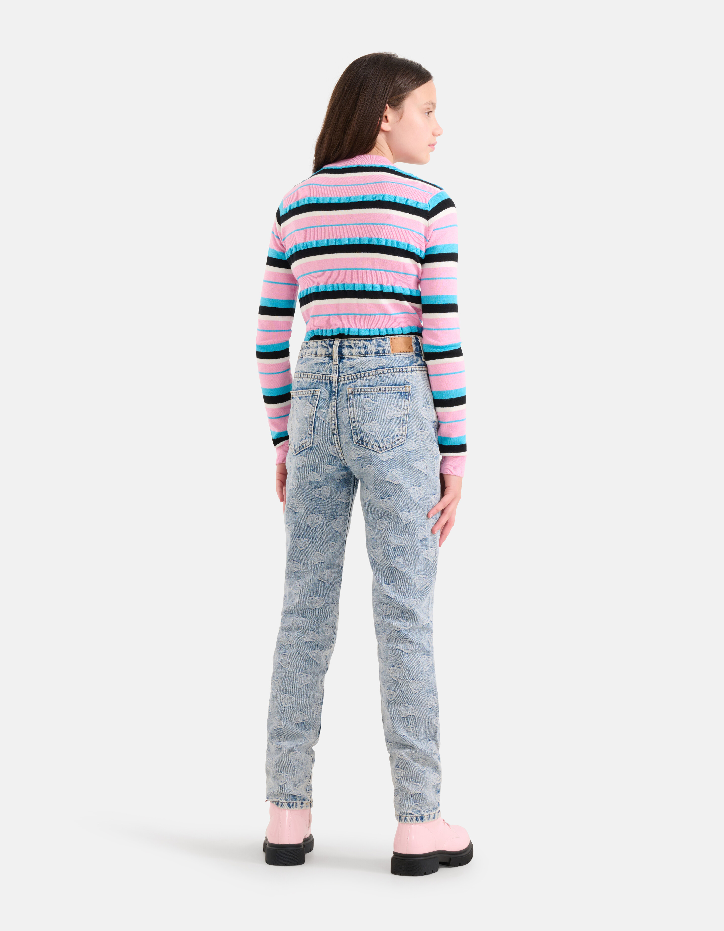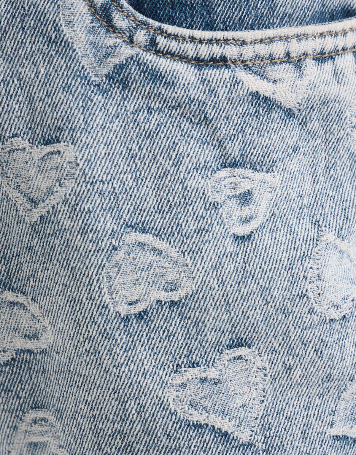 Wir lieben auffällige Styles! Die Jacquard Tapered Jeans hat eine hohe Taille, ein nicht dehnbares Material, einen 5-Pocket-Stil, eine taillierte Passform und einen Knopf- und Reißverschluss. Das Modell zeichnet sich durch die blaue Farbe des gebleichten Denims mit einem eingewebten Jacquard-Print aus. Der Druck hat die Form von verschiedenen Herzen, was einen einzigartigen Effekt ergibt. Ein schönes Detail ist der elastische Bund, mit dem sich die Taille verstellen lässt. Es ist aus Baumwolle und Polyester gefertigt. Durch diese Zusammensetzung ist es von hoher Qualität, formstabil und bequem. Vervollständigen Sie den Look mit einem Pullover und einem Paar cooler Stiefel und Sie sind startklar!