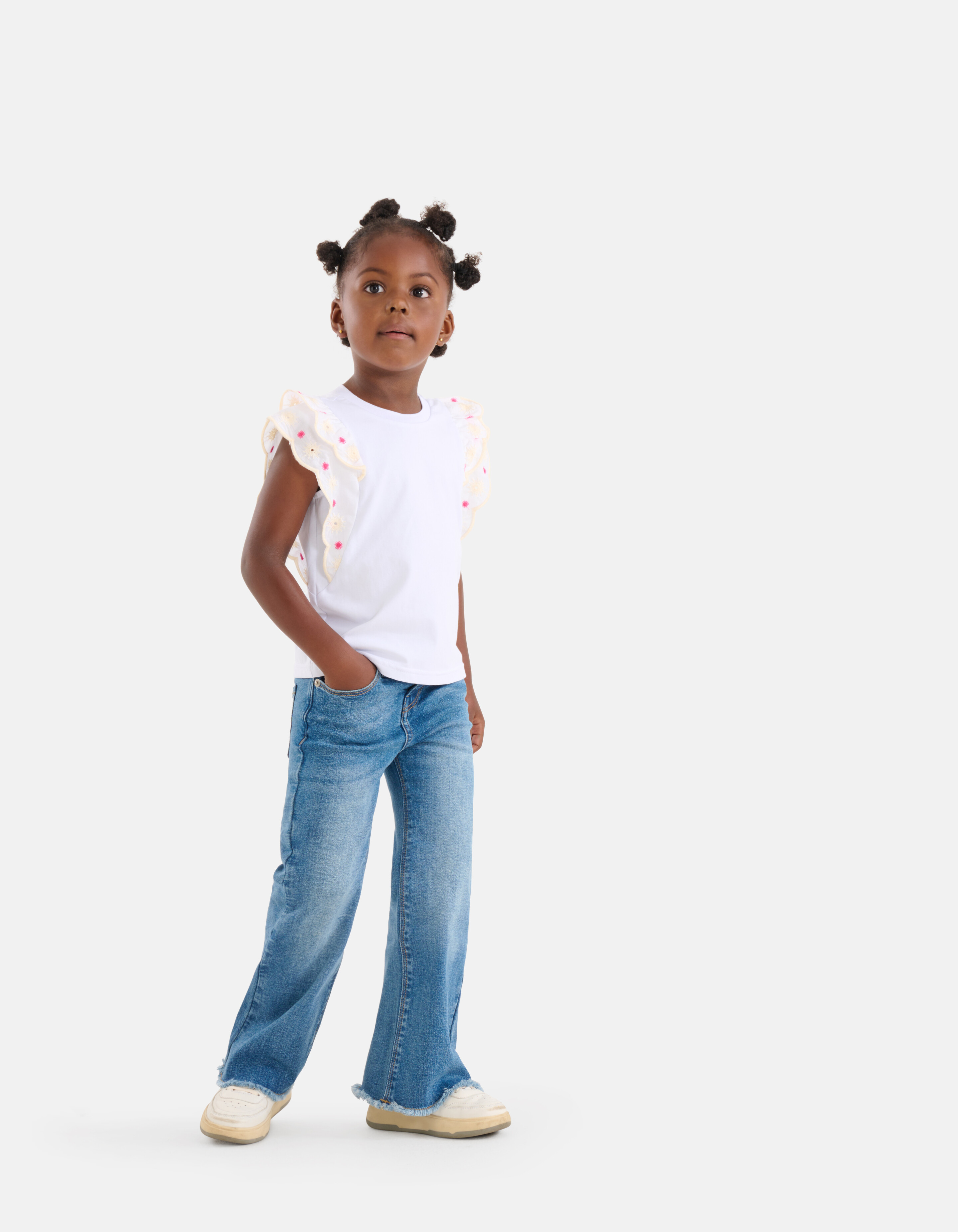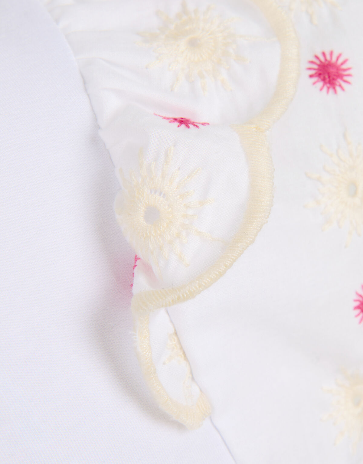 Auf die Details kommt es an! Das Embroidery Top hat einen hohen Ausschnitt, eine normale Passform und ist ärmellos. Der Artikel zeichnet sich durch die weiße Farbe mit Rüschen auf der Vorder- und Rückseite aus. Ein hübsches Detail an den Rüschen sind die rosa und cremefarbenen Stickereien. Das Kleidungsstück besteht aus 100% Baumwolle und ist daher von hoher Qualität und angenehm zu tragen. Vervollständigen Sie den Look mit rosa Shorts und einer Weste für einen stilvollen Look!