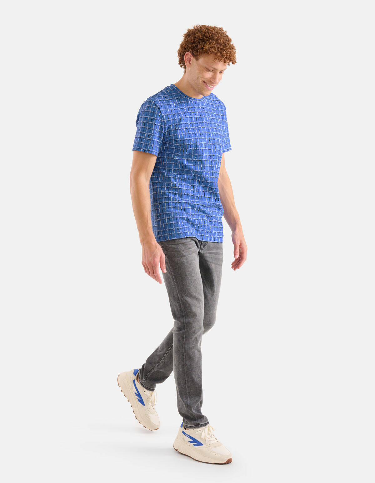 Must-have! Das bedruckte T-Shirt hat kurze Ärmel, einen hohen Rundhalsausschnitt und eine normale Passform. Der Artikel zeichnet sich durch die blaue Farbe mit einer Allover-Grafik aus. Der Aufdruck hat ein kariertes Design in den Farben Schwarz und Weiß. Kombinieren Sie es mit Shorts und Sie sind startklar! Der Artikel hat eine Gesamtlänge von 72,5 cm bei Größe M.