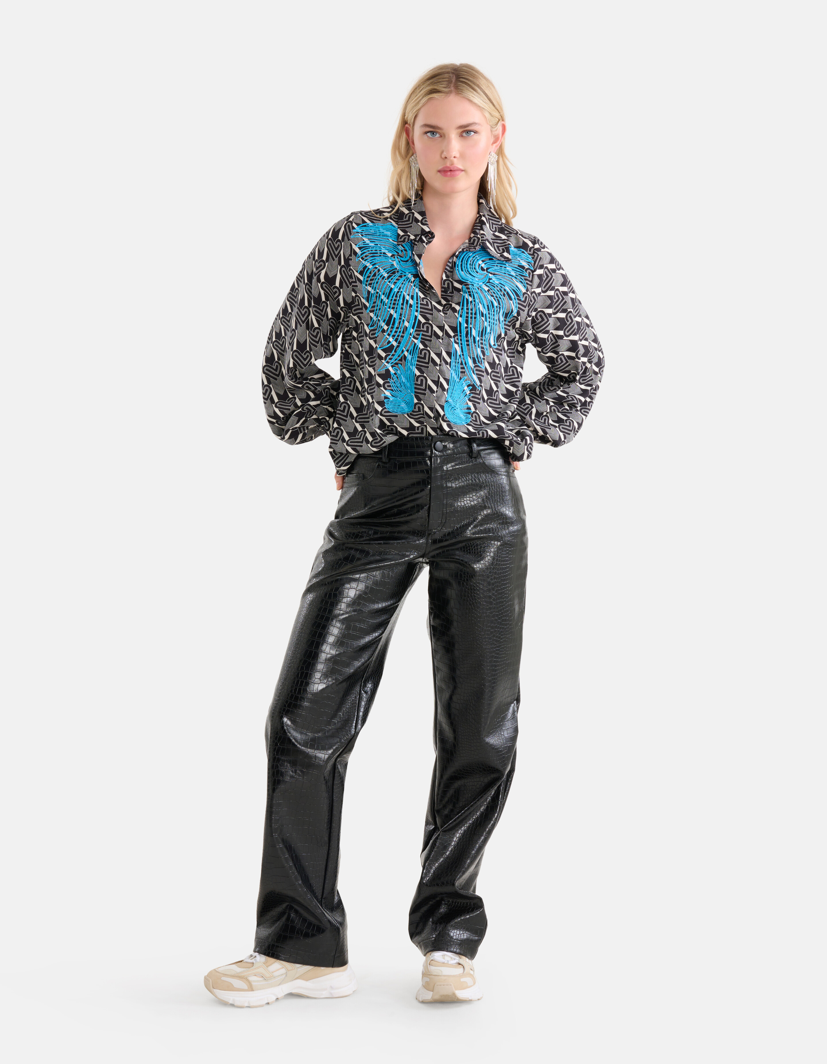 Satteln Sie auf für ein stilvolles Abenteuer mit Shoeby! Die Bluse mit Stickerei hat lange Ärmel, einen Kragen, ein nicht dehnbares Material, einen verdeckten Knopfverschluss und eine normale Passform. Der Artikel zeichnet sich durch die schwarze Farbe mit einem grafischen Allover-Print in der Farbe Weiß aus. Außerdem hat die Bluse ein gesticktes Detail auf der Vorderseite. Die Stickerei hat die Form von Flügeln in blauer Farbe. Die Bluse besteht aus 100 % Viskose und ist daher von hoher Qualität, farbecht und bequem. Vervollständigen Sie das Outfit mit einer veganen Lederhose mit Krokoprägung und einem Paar klobiger Turnschuhe für einen stilvollen Look! Das Model ist 176 cm groß und trägt Größe S. Der Artikel hat eine Gesamtlänge von 73 cm bei Größe S.