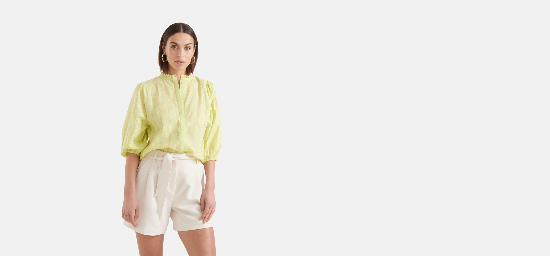 Ein Blickfang! Die Lurex-Detail-Bluse hat dreiviertel Puffärmel, einen hohen Halsausschnitt, einen Knopfverschluss und eine lockere Passform. Der Artikel zeichnet sich durch die lindgrüne Farbe mit einem Muster aus Lurexfäden im Stoff aus. Die Lurexfäden haben eine goldene Farbe. Das Kleidungsstück besteht zu 100 % aus Baumwolle, was ihm eine hohe Qualität und ein angenehmes Tragegefühl verleiht. Vervollständigen Sie den Look mit einem einfachen Oberteil für darunter, weißen Shorts und klobigen Turnschuhen für einen lässigen Sommer-Chic-Look! Das Model ist 178 cm groß und trägt Größe S. Der Artikel hat eine Gesamtlänge von 62 cm bei Größe S.