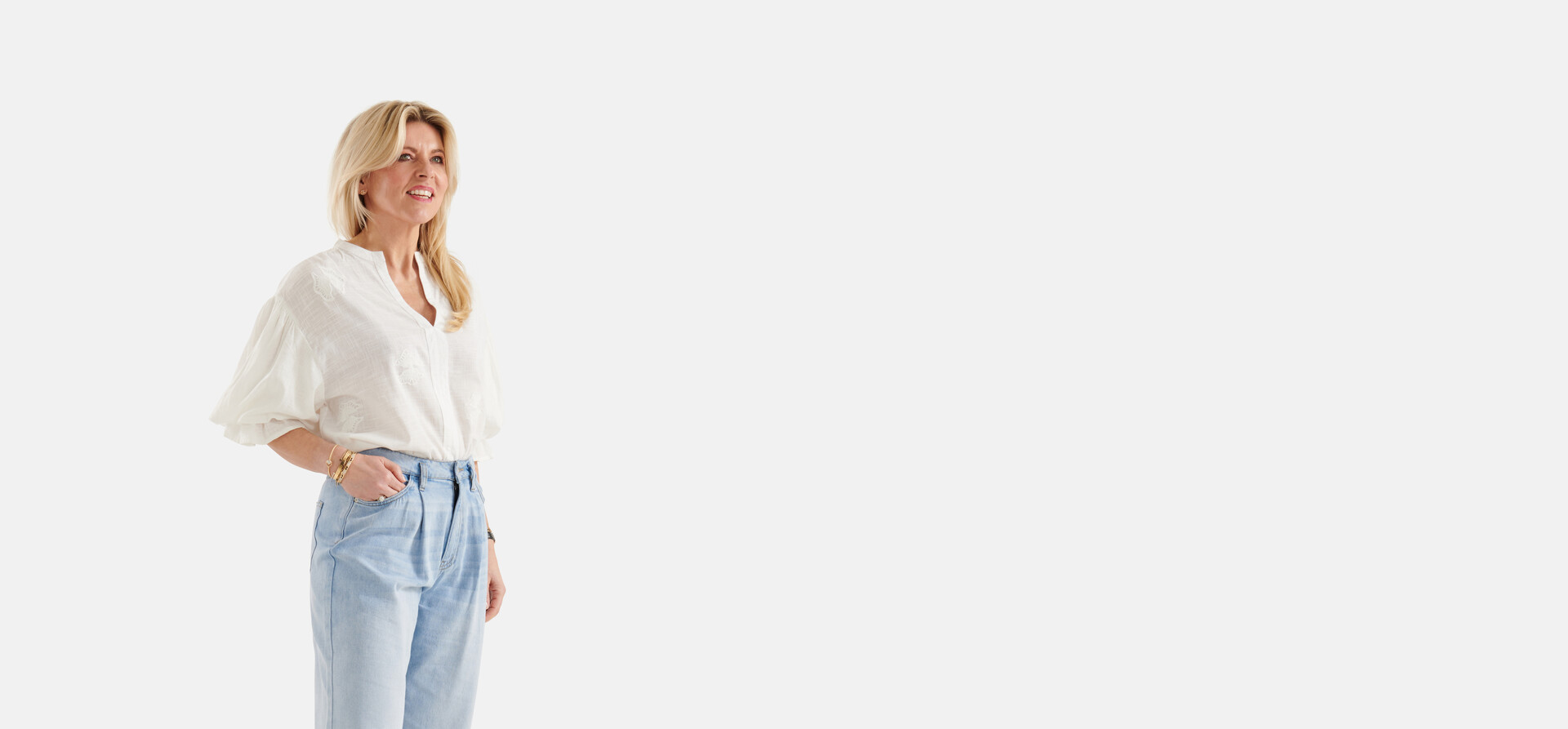 Die Embroidery Blouse hat dreiviertel Puffärmel, einen V-Ausschnitt und eine lockere Passform. Das Kleidungsstück zeichnet sich durch die cremefarbene Farbe mit einem Stickerei-Print im Stoff aus. Die Bluse hat außerdem Rüschen an den Ärmeln für einen verspielten Effekt. Es ist aus Baumwolle gefertigt, was es robust und angenehm zu tragen macht. Kombinieren Sie es mit Jeans mit weitem Bein für einen raffinierten Look! Die Model ist 174 cm groß und trägt Größe XS/S. Der Artikel hat eine Gesamtlänge von 65 cm bei Größe XS/S.