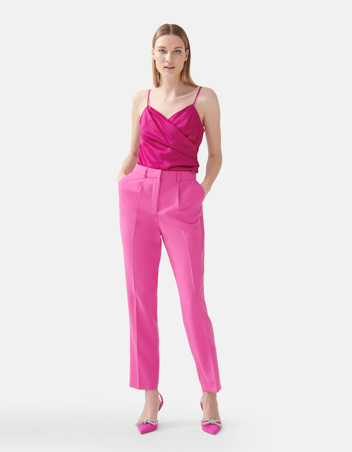 Die Straight Fit Hose hat eine hohe Taille, eine gerade Passform, einen knöchelhohen Schnitt, Seitentaschen, Paspeltaschen und einen Knopf- und Reißverschluss. Das Teil zeichnet sich durch seine trendige rosa Farbe aus. Die Hose ist aus Polyester und Elastan gefertigt. Diese Zusammensetzung macht die Hose formstabil, dezent dehnbar und stark in der Qualität. Vervollständigen Sie den Look mit dem Satin-Singlet oder kombinieren Sie es mit dem passenden Blazer für ein komplettes Set! Das Model ist 177 cm groß und trägt Größe S. Der Artikel hat eine Innennaht von 74 cm bei Größe S.