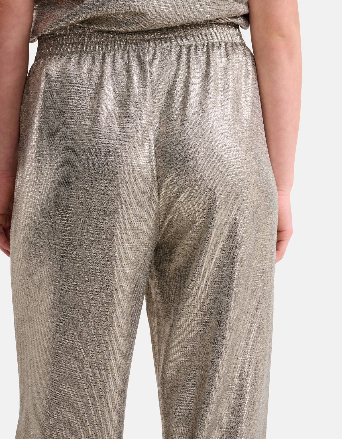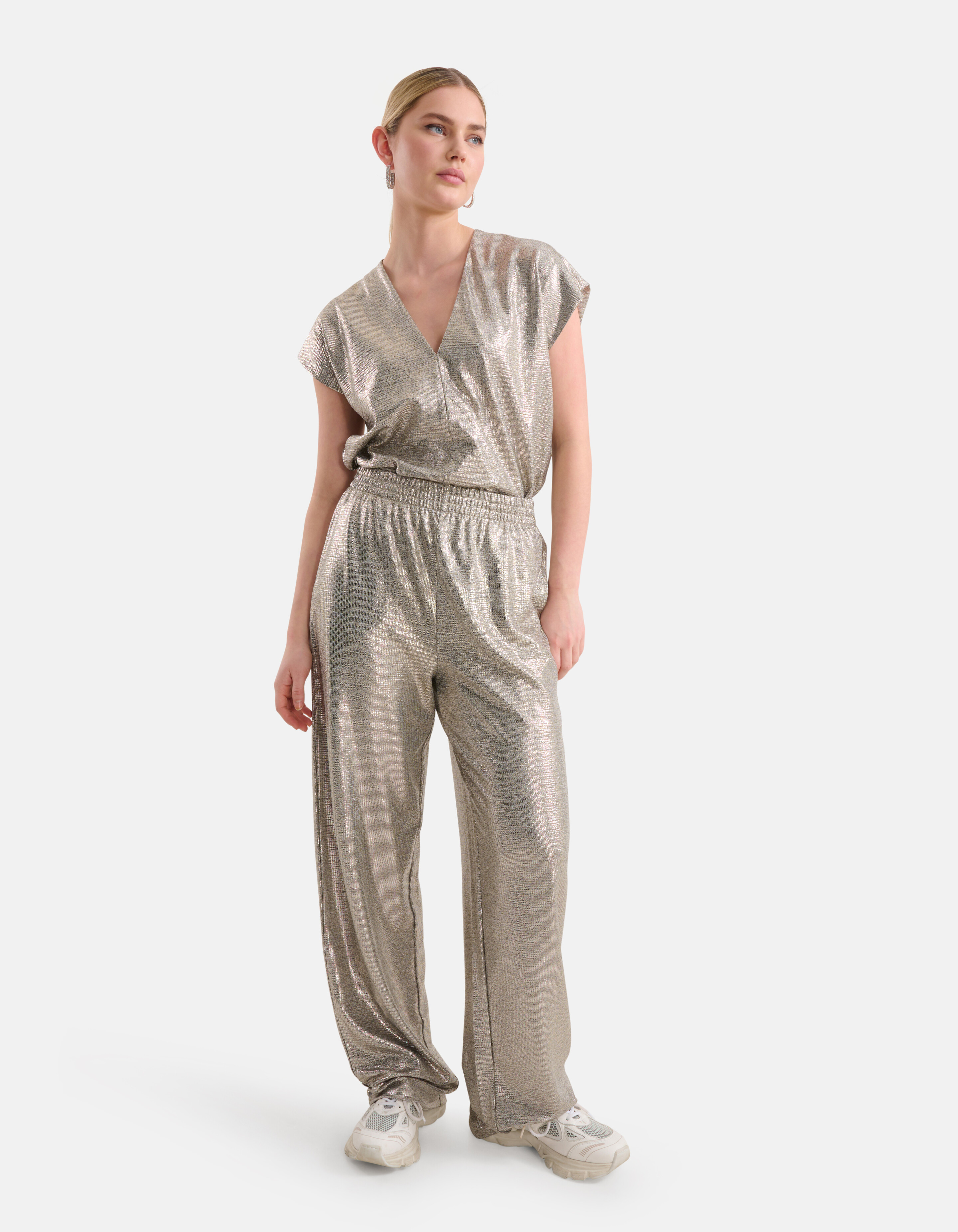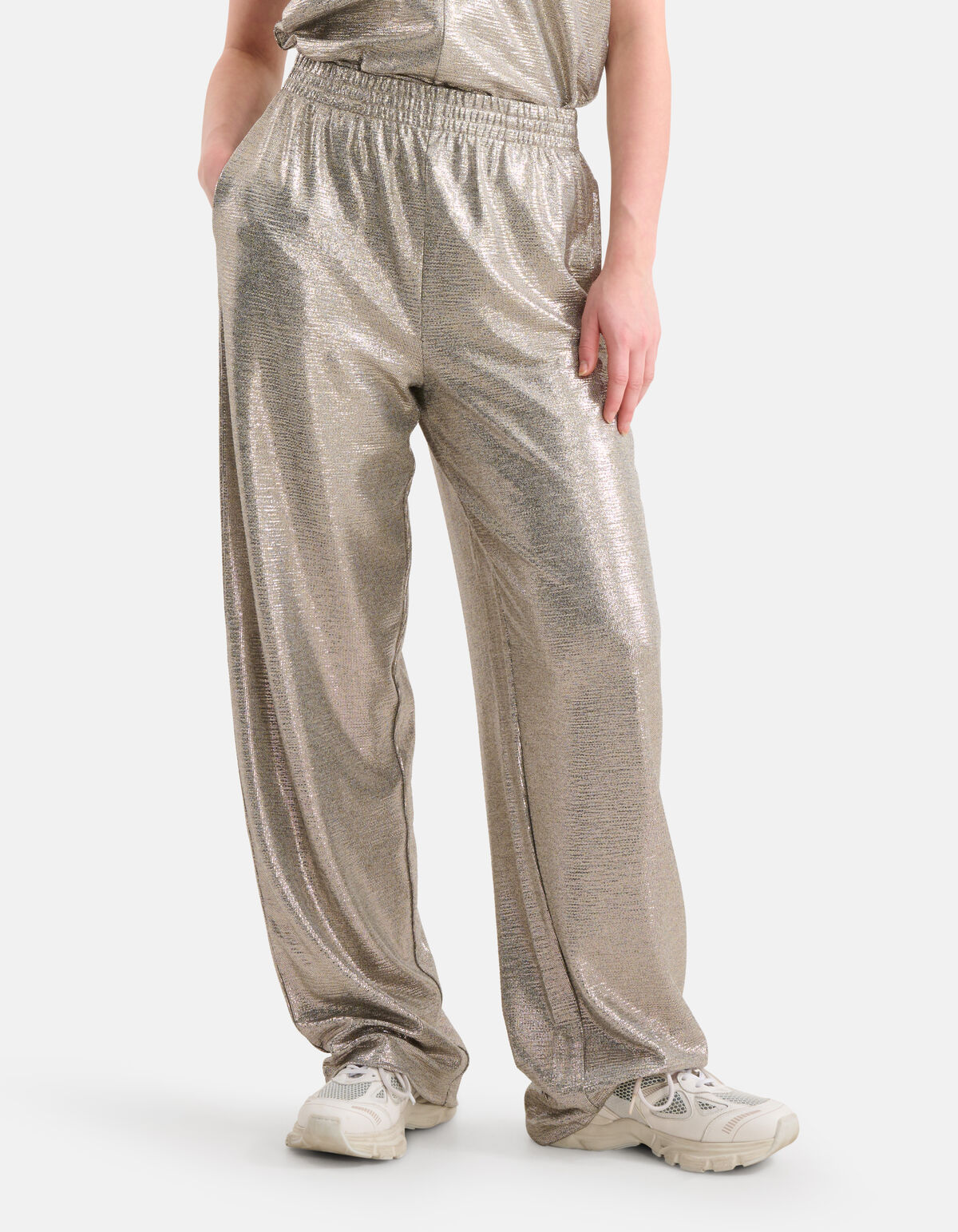 Der ultimative Look! Die Metallic-Hose Silver hat eine hohe Taille, eine ausgestellte Passform, Seitentaschen, einen Stretchstoff und ein Gummiband in der Taille. Der Artikel zeichnet sich durch die silberne Farbe mit metallischer Beschichtung aus. Diese Beschichtung sorgt für ein glänzendes Detail und verleiht der Hose einen dezenten Glitzereffekt. Es besteht aus Polyester und Elasthan. Durch diese Zusammensetzung ist es bügelfrei, hochwertig und angenehm zu tragen. Kombinieren Sie die Hose mit dem passenden Coated Silver Top für einen stilvollen Look. Perfekt für jeden Anlass!