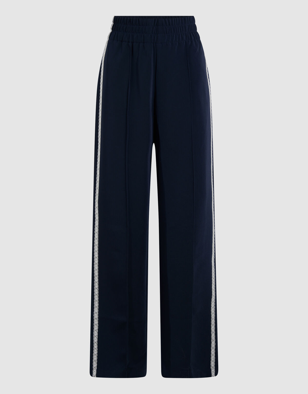 Lassen Sie Ihren Stil für sich selbst sprechen mit diesem einzigartigen Artikel! Diese sportliche Hose mit weitem Bein in Dunkelblau hat eine hohe Taille, einen elastischen Bund, einen hohen Stretchanteil und eine weite Beinform. Die dunkelblaue Farbe und der Spitzenbesatz an den Seiten sind weitere Merkmale dieses Modells. Die Hose ist aus Polyester und Elastan gefertigt. Diese Zusammensetzung sorgt für eine hohe Qualität und einen angenehmen Tragekomfort der Hose. Das Model ist 176 cm groß und trägt die Größe S. Die Hose hat eine Innennaht von 83 cm in Größe S. Kombinieren Sie die Hose mit einem hübschen Oberteil für ein trendiges Outfit!