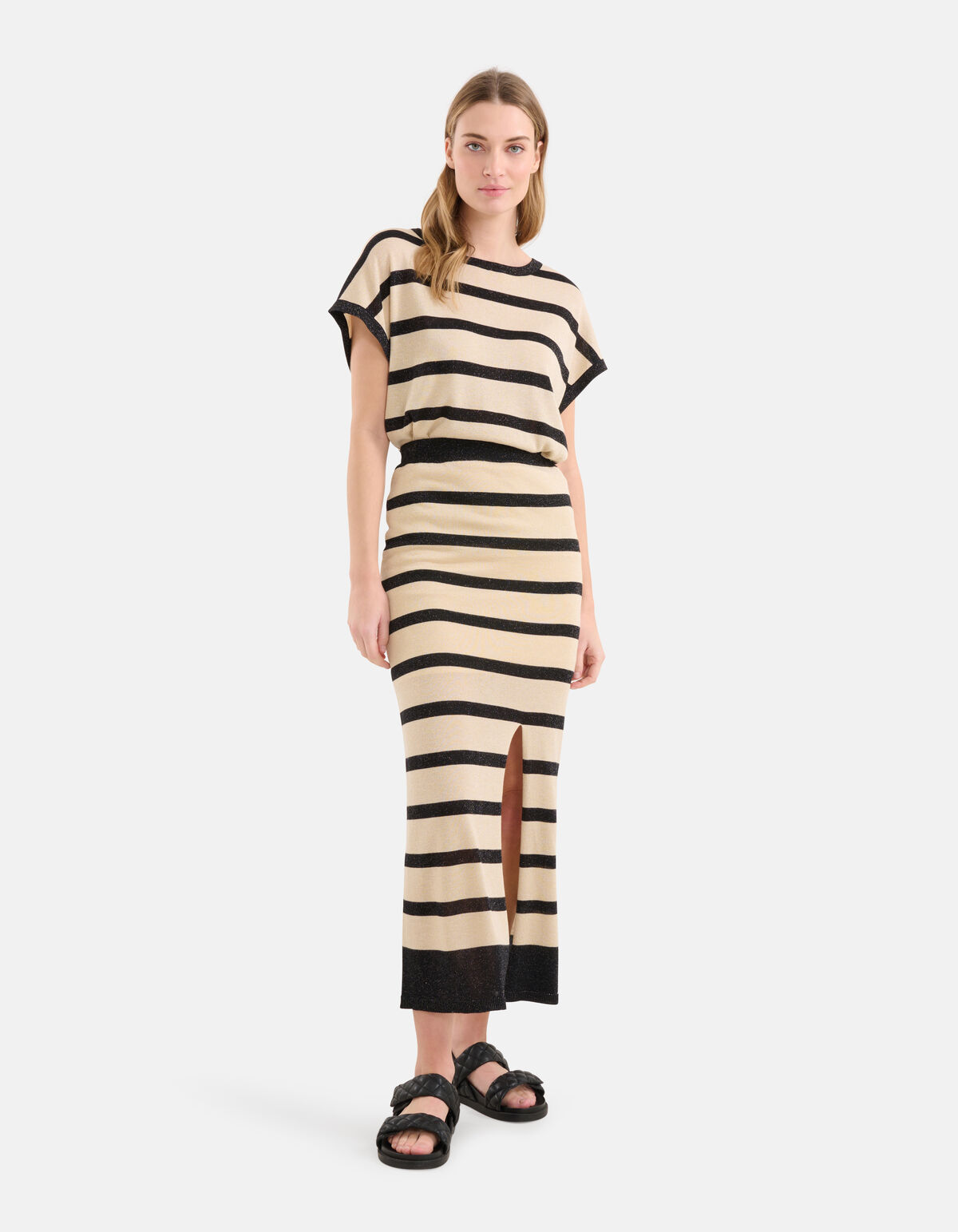 Zeigen Sie Ihre feminine Seite mit dem Glitter Striped Midi Skirt. Dieser cremefarbene Bleistiftrock hat eine taillierte Passform, eine hohe Taille und eine Midi-Länge, die mit einem stilvollen Schlitz-Detail für einen Hauch von Eleganz abgeschlossen ist. Außerdem hat der Rock ein schwarzes Streifenmuster, das über den ganzen Rock verteilt ist. Der Rock ist aus Viskose und Polyamid gefertigt. Diese Zusammensetzung macht ihn hochwertig, form- und farbecht, knittert nicht und trägt sich angenehm.