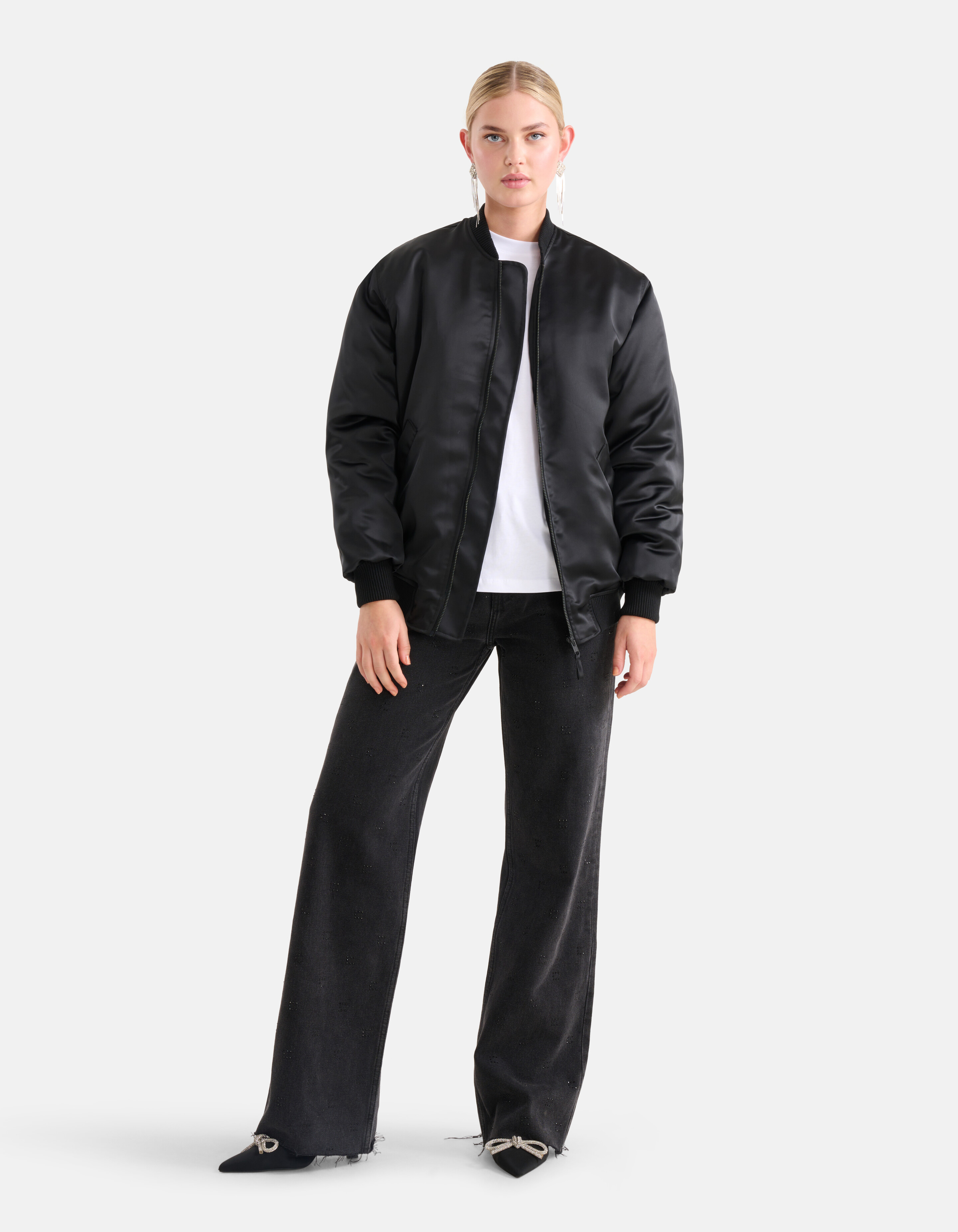 Kraftvoll und mutig! Die Satin Bomber Jacket ist ein Muss für Ihre Garderobe. Die Jacke hat lange Ärmel, einen hohen Halsausschnitt, ein nicht dehnbares Material, ein gestepptes Innenfutter, einen Reißverschluss, Eingrifftaschen und eine übergroße Passform. Das Modell zeichnet sich durch seinen geräumigen Schnitt und die schwarze Farbe aus. Ein schönes Detail ist der glänzende Stoff, der ein Gefühl von Satin vermittelt. Es besteht zu 100 % aus Polyester und ist daher von hoher Qualität und formstabil. Tragen Sie es zu einem weißen T-Shirt, einer Jeans mit weitem Bein und einem Paar hochhackigen Schuhen für einen trendigen Look! Das Model ist 176 cm groß und trägt Größe S. Der Artikel hat eine Gesamtlänge von 72 cm bei Größe S.