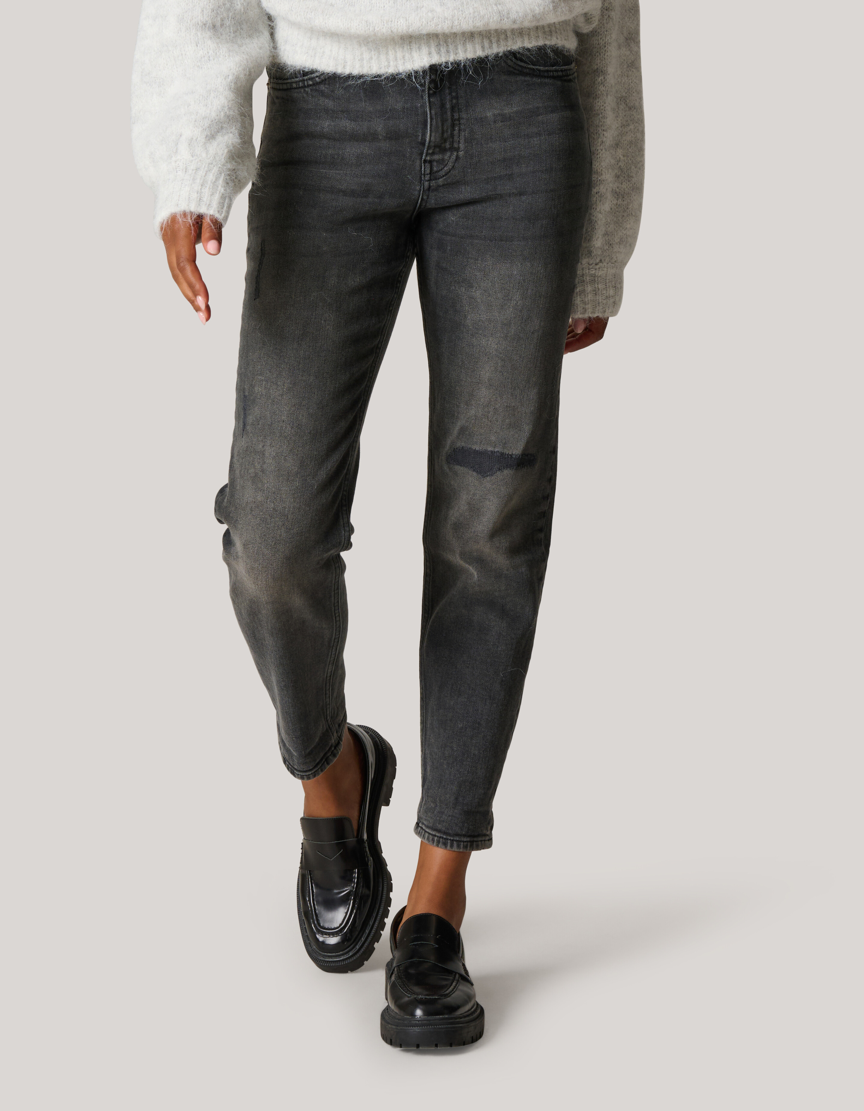 Rocke deine Denim, erobere die Welt! Die Tapered Fit Jeans hat eine hohe Taille, ein 5-Pocket-Design, eine Länge von 29, einen Low-Stretch-Stoff, eine konische Passform und einen Knopf- und Reißverschluss. Der Artikel zeichnet sich durch die dunkelgraue Farbe mit einer Waschung und dezenten beschädigten Details auf der Vorderseite aus. Die beschädigten Details sind in den Stoff eingearbeitet, wodurch er an den Knien dünner wird, aber nicht durchscheint. Außerdem hat die Jeans eine Knöchellänge und dunkelgraue Nähte - der perfekte Abschluss! Die Tapered-Fit-Passform bedeutet, dass der obere Teil der Jeans wie eine gerade Passform fällt, sich aber zu den Knöcheln hin ein wenig verjüngt. Sie ist aus Baumwolle und Elastan gefertigt. Diese Zusammensetzung macht sie robust in der Qualität, leicht dehnbar und bequem. Vervollständigen Sie das Outfit mit einem Oberteil mit Monogramm, und schon sind Sie startklar! Das Model ist 172 cm groß und trägt Größe 27. Der Artikel hat eine Innennaht von 72,5 cm bei Größe 27.