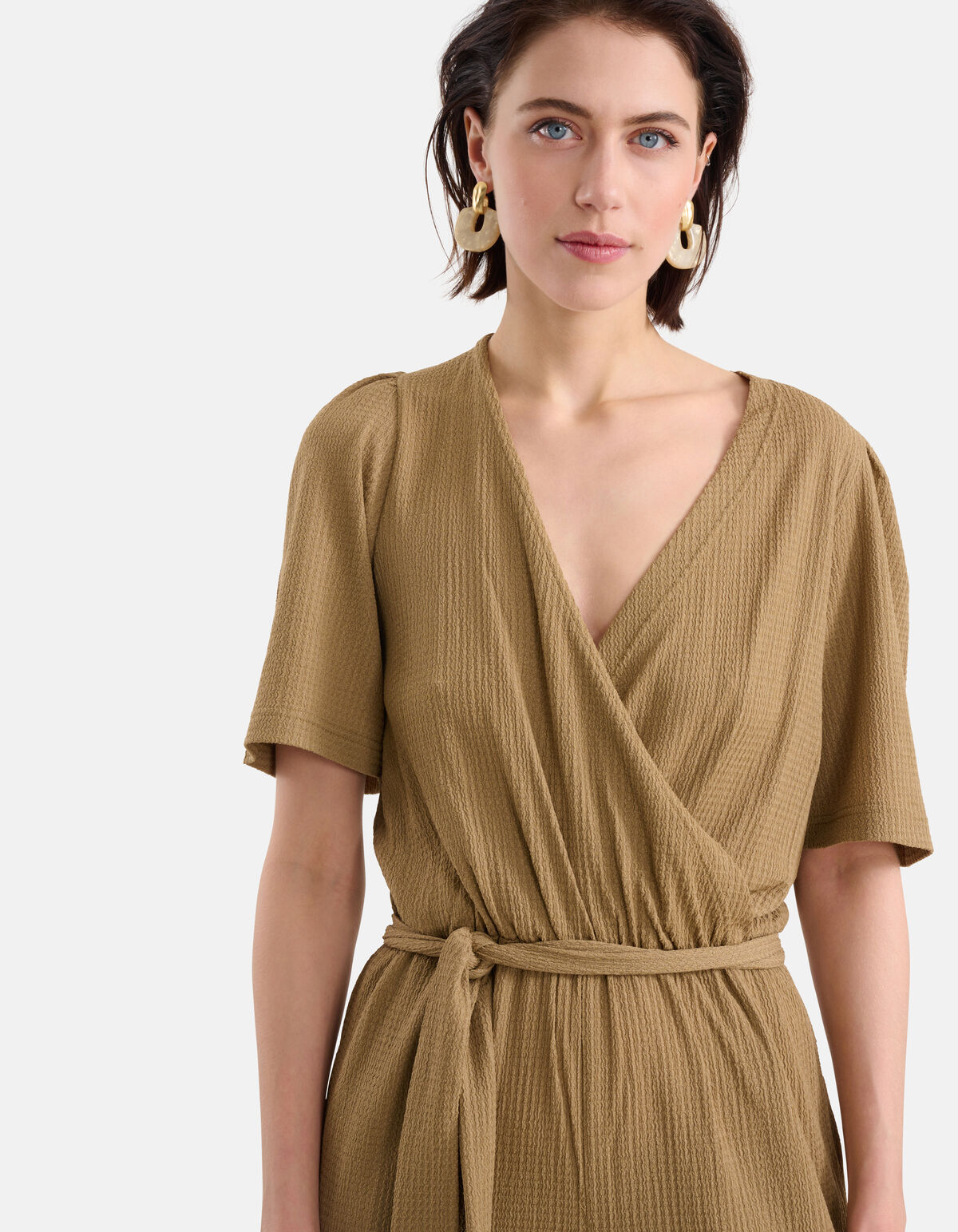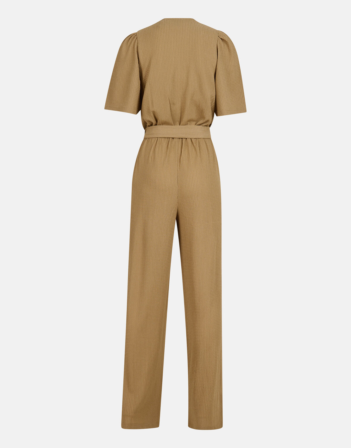 Treten Sie mit dem Crinkle Jumpsuit Taupe stilvoll hervor! Der Overall hat ein ausgestelltes Modell, eine weite Beinpassform, einen V-Ausschnitt und kurze Ärmel. Ein schönes Detail ist das Knopfdetail vorne. Dadurch wird die Taille wunderschön betont. Der Overall hat einen entspannten und stilvollen Look. Dies macht den Artikel zu einer großartigen Wahl für einen entspannten und trendigen Look. Darüber hinaus besteht der Overall aus Polyamid und Elasthan. Dadurch ist es sehr dehnbar, angenehm zu tragen und behält seine Form. Kombinieren Sie es mit einem Paar Sneakers für einen sportlichen Look oder mit einem Paar Heels für einen feminineren Look.