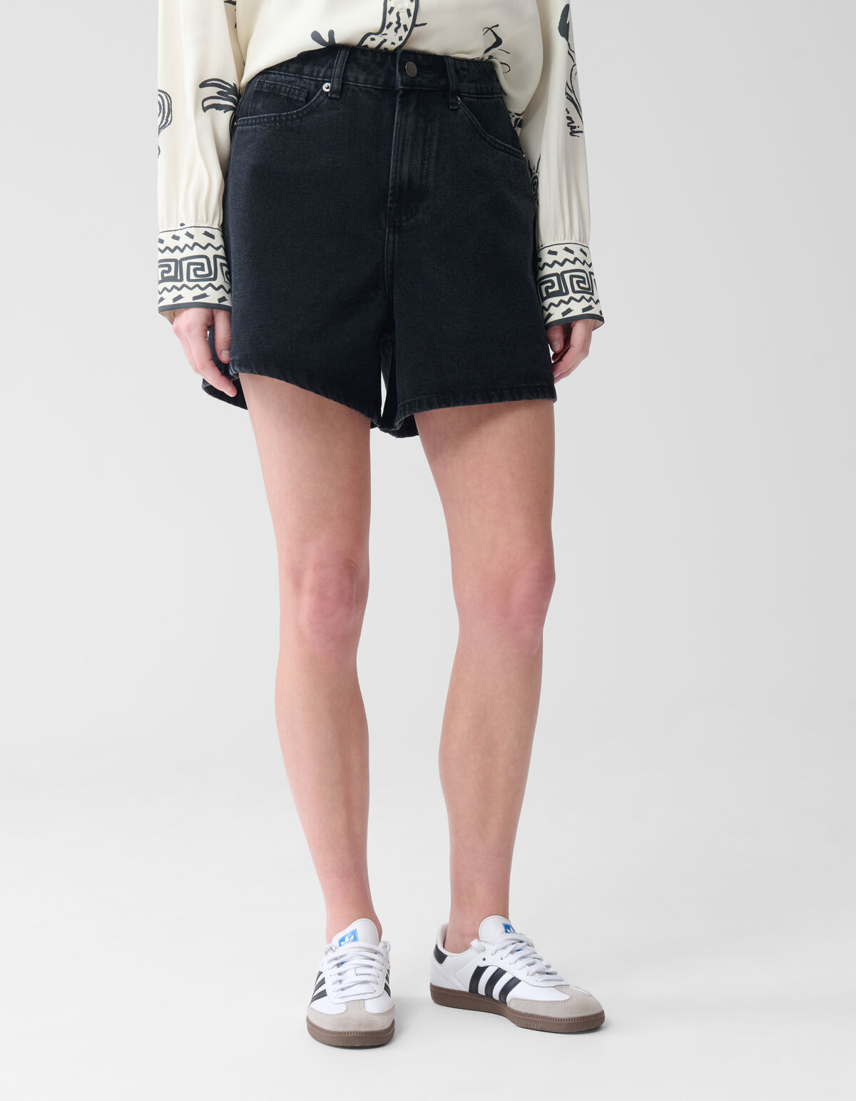 Must-have! Die Denim Short Black hat eine hohe Taille, ein kurzes Bein, einen Knopf- und Reißverschluss, ein 5-Pocket-Design, ein nicht dehnbares Material und eine normale Passform. Außerdem zeichnen sich die Shorts durch ihre schwarze Farbe aus. Die Shorts bestehen aus 100% Baumwolle und sind daher sehr angenehm zu tragen. Das Model hat eine Größe von 176 cm und trägt Größe 27. Der Artikel hat eine Innenbeinlänge von 24,5 bei Größe S.