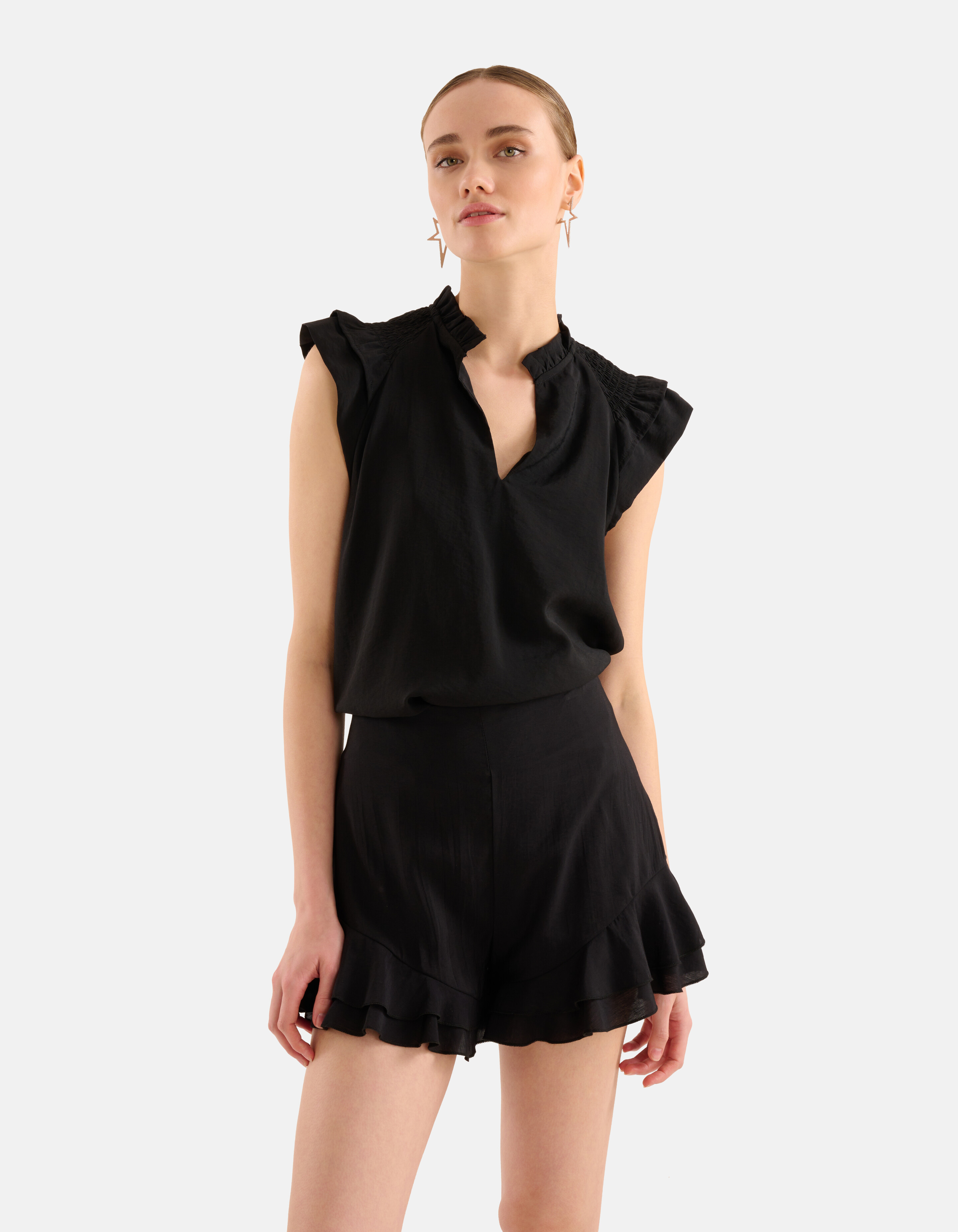 Perfekt in Schwarz! Die Ruffle Short hat eine hohe Taille, ein kurzes Bein, eine normale Passform und einen seitlichen Reißverschluss. Der Artikel zeichnet sich durch die schwarze Farbe mit Rüschen am unteren Ende des Hosenbeins aus. Die Shorts sind aus Viskose und Polyamid gefertigt, was sie zu einer robusten Qualität, einer guten Passform, Farbechtheit und Tragekomfort macht. Vervollständigen Sie den Look mit dem passenden Rüschen-Top für ein komplettes Set! Das Model ist 179 cm groß und trägt Größe S. Der Artikel hat eine Innennaht von 9,5 cm bei Größe S.