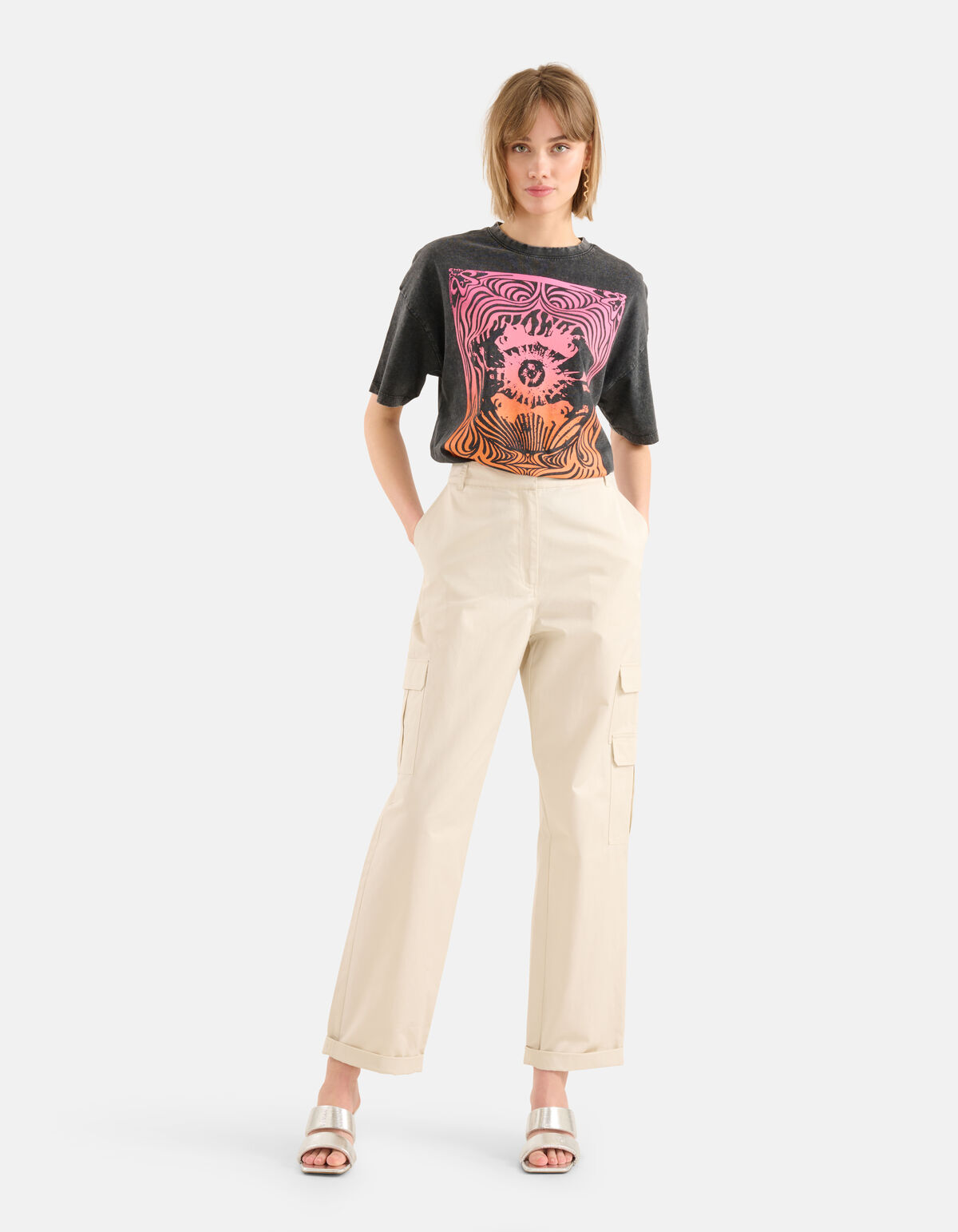 Druck es! Artwork T-Shirt hat kurze Ärmel, einen hohen Halsausschnitt und eine lockere Passform. Der Artikel zeichnet sich durch die dunkelgraue Farbe mit einem bunten Grafikdruck auf der Vorderseite aus. Die Farben Orange und Pink verleihen ihm eine verspielte Wirkung. Es besteht zu 100 % aus Baumwolle und ist daher von hoher Qualität und angenehm zu tragen. Vervollständigen Sie den Look mit einer Cargohose und klobigen Turnschuhen, und schon sind Sie startklar! Das Model ist 179 cm groß und trägt Größe S. Der Artikel hat eine Gesamtlänge von 62,5 cm bei Größe S.