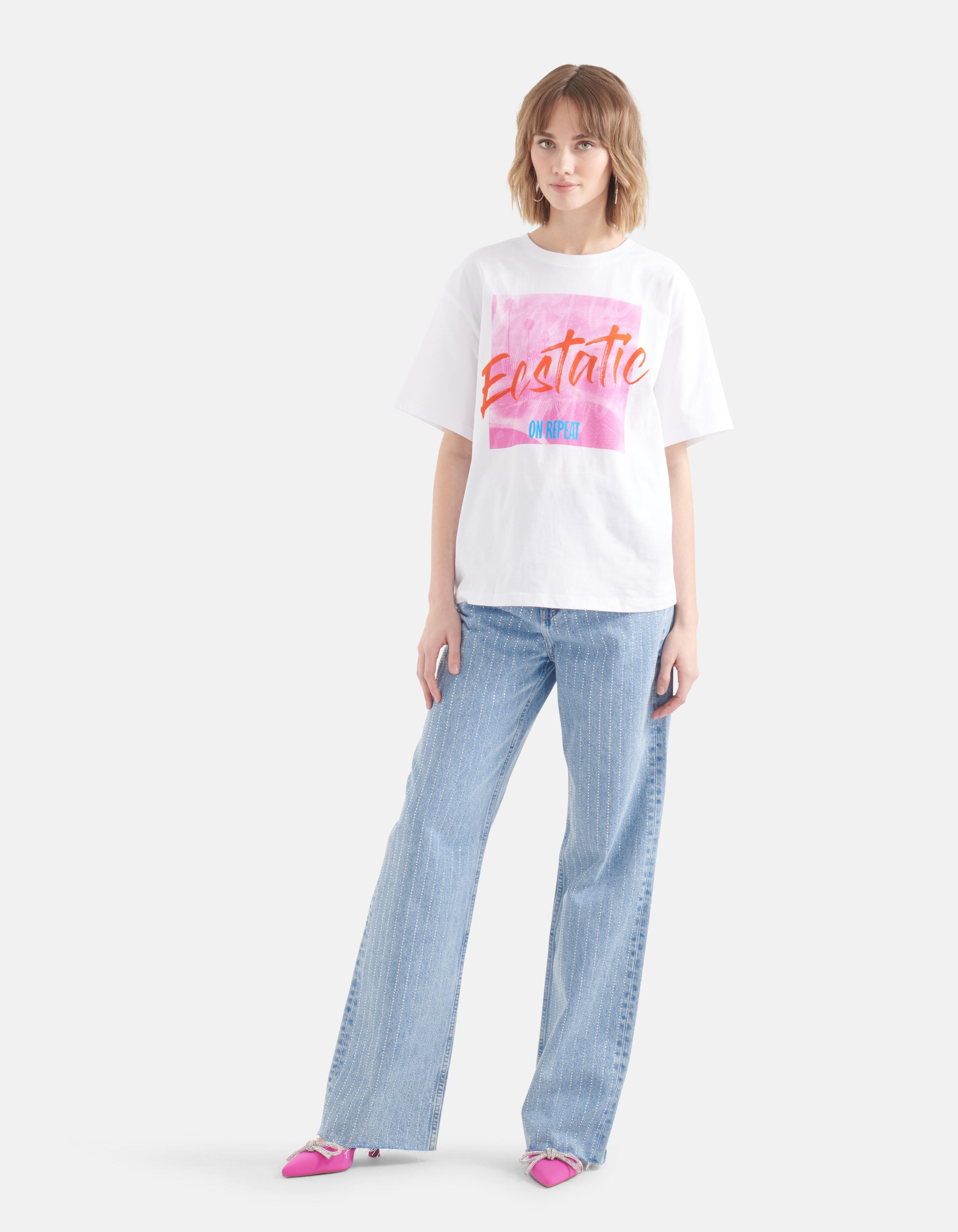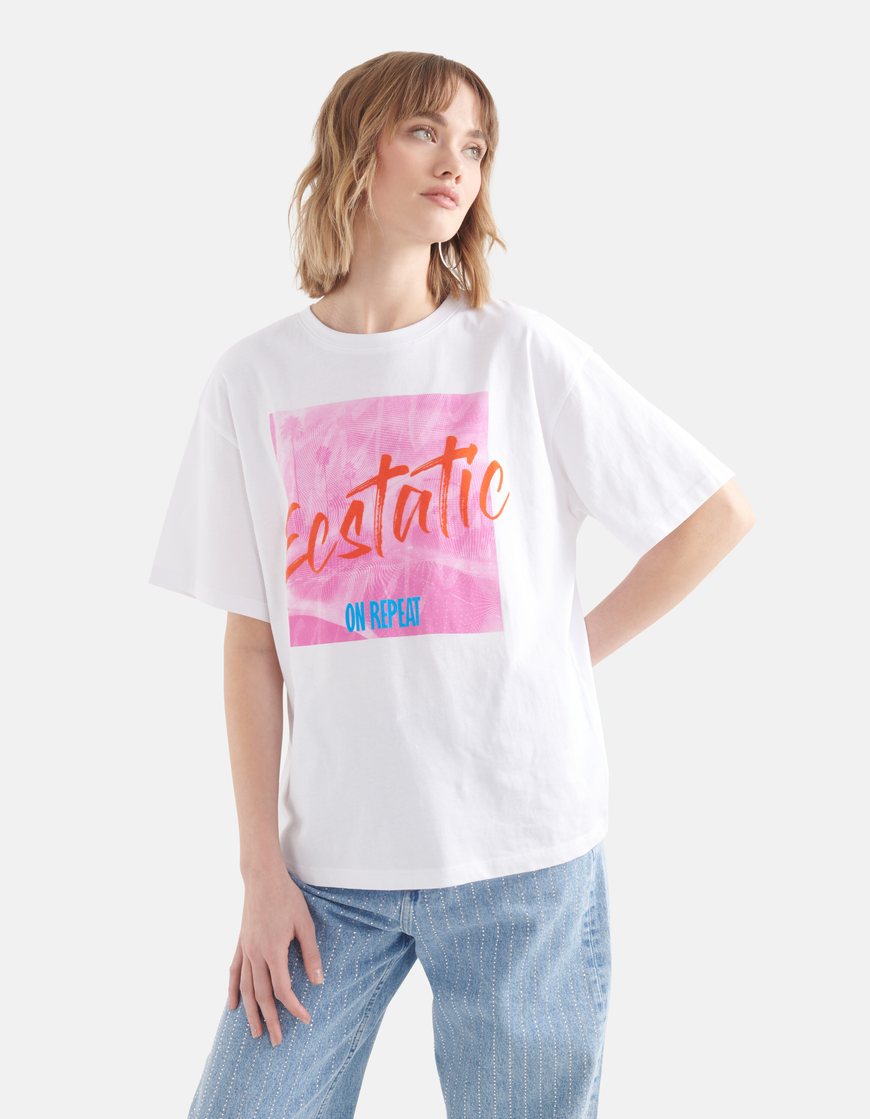 Druck es! Artwork T-Shirt mit kurzen Ärmeln, hohem Rundhalsausschnitt und übergroßer Passform. Der Artikel zeichnet sich durch seine weiße Farbe mit einem Artwork auf der Vorderseite aus. Das Artwork zeigt einen rosa, roten und blauen Aufdruck mit dem Text: "Ecstatic on repeat''. Das T-Shirt besteht aus 100 % Baumwolle und ist daher von hoher Qualität und angenehm zu tragen. Vervollständigen Sie den Look mit einer Strassjeans mit weitem Bein und einem Paar strassbesetzter Absätze für einen stilvollen Look! Das Model ist 179 cm groß und trägt Größe S. Der Artikel hat eine Gesamtlänge von 65 cm bei Größe S.