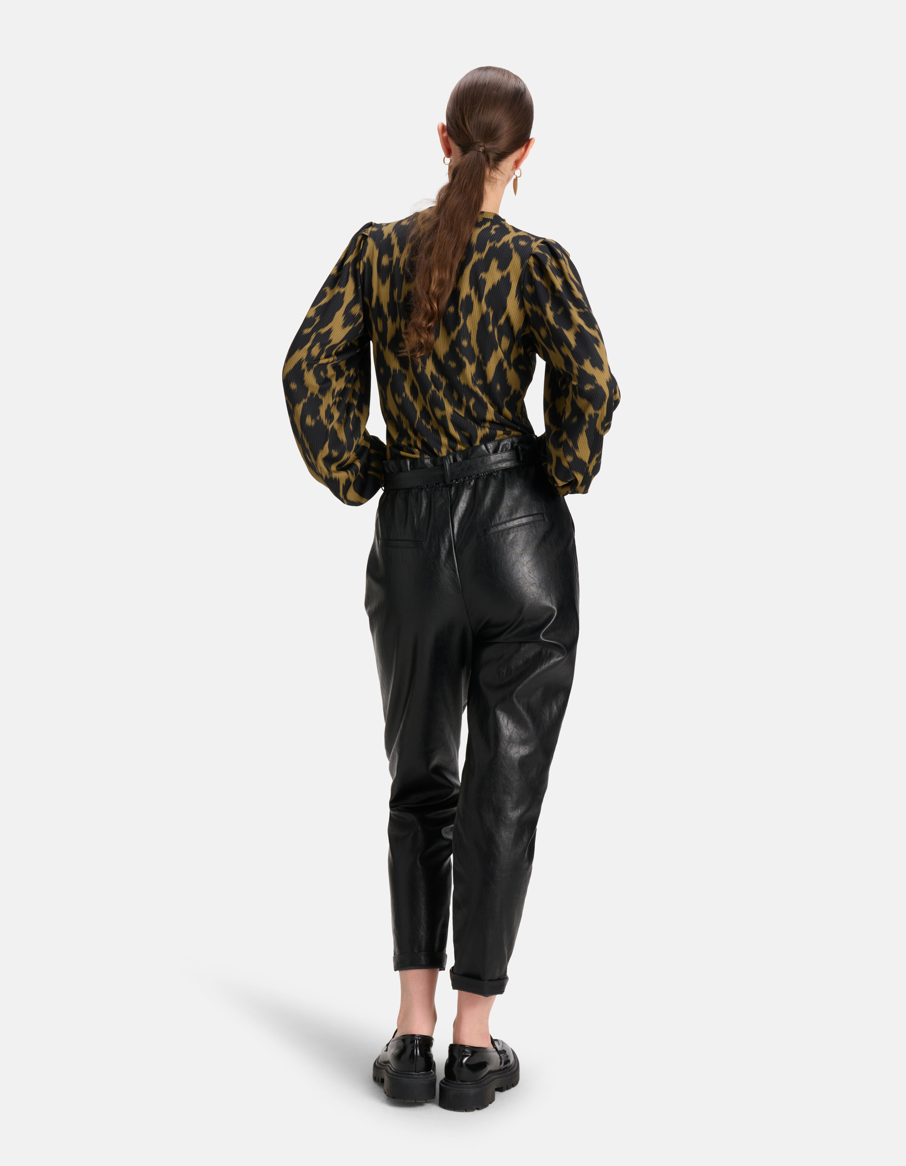 Das T-Shirt hat lange Ärmel, einen hohen Rundhalsausschnitt und eine reguläre Passform. Das Kleidungsstück zeichnet sich durch seine weiten Ärmel, die dunkelgrüne Farbe mit Leopardenprint und den gerippten Jersey-Stoff aus. Jersey sorgt dafür, dass das T-Shirt besonders bequem ist und sich gut dehnen lässt. Außerdem ist das T-Shirt aus Polyester und Elastan gefertigt, wodurch es bügelfrei und formstabil ist. Kombiniere es mit einer Hose aus veganem Leder und Loafers für einen stilvollen Look! Das Model ist 179 cm groß und trägt Größe S. Der Artikel hat eine Gesamtlänge von 64,5 cm bei Größe S.