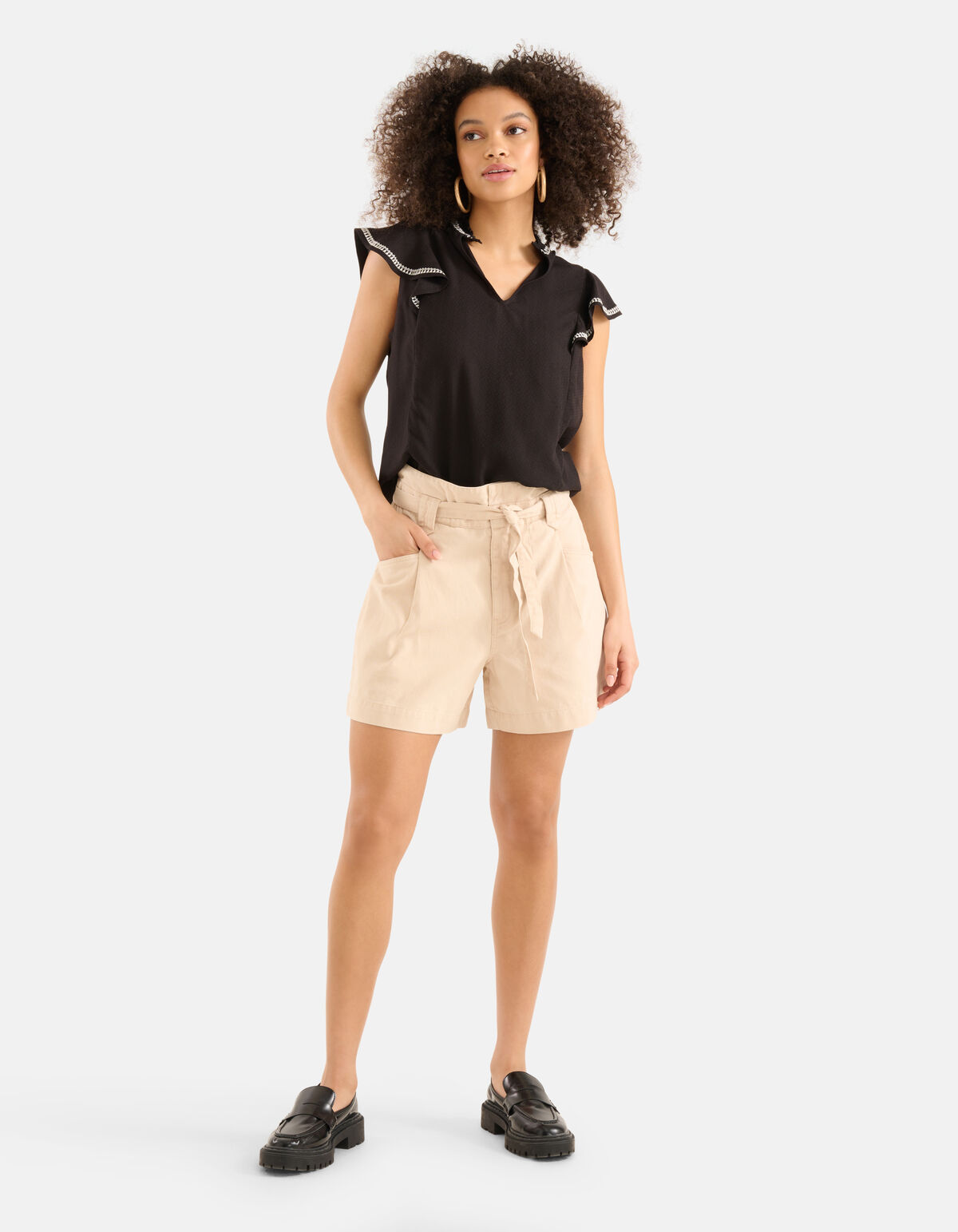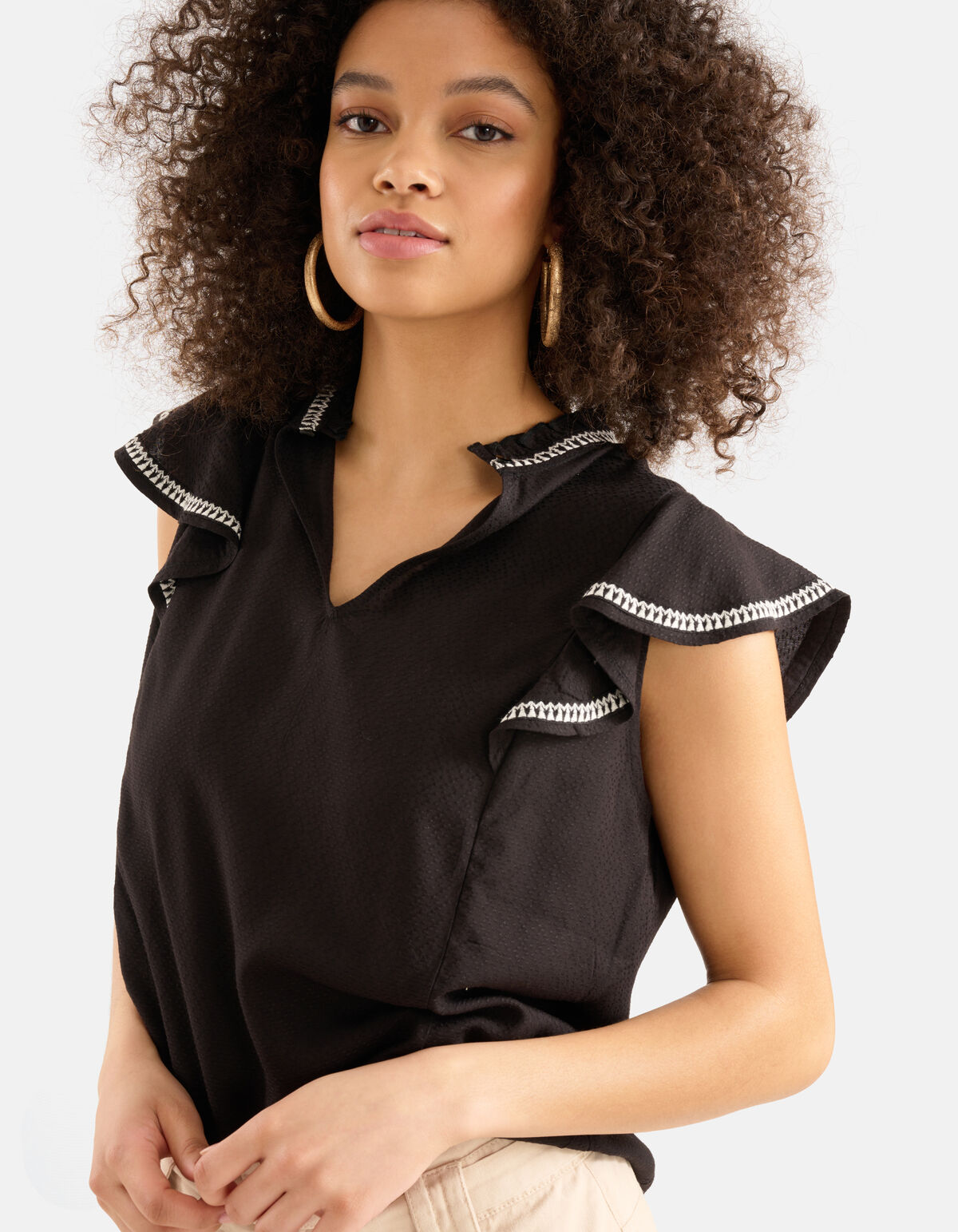 Auf die Details kommt es an! Das Embroidery Top hat eine normale Passform, einen V-Ausschnitt, einen Knopfverschluss vorne und ist ärmellos. Der Artikel zeichnet sich durch die schwarze Farbe mit einem eingewebten Jacquard-Print aus. Außerdem hat das Oberteil Rüschen an den Schultern mit weißer Stickerei. Vervollständigen Sie den Look mit beigen Shorts und klobigen Loafers für einen stilvollen Auftritt! Das Model ist 173 cm groß und trägt Größe S. Der Artikel hat eine Gesamtlänge von 61 cm bei Größe S.