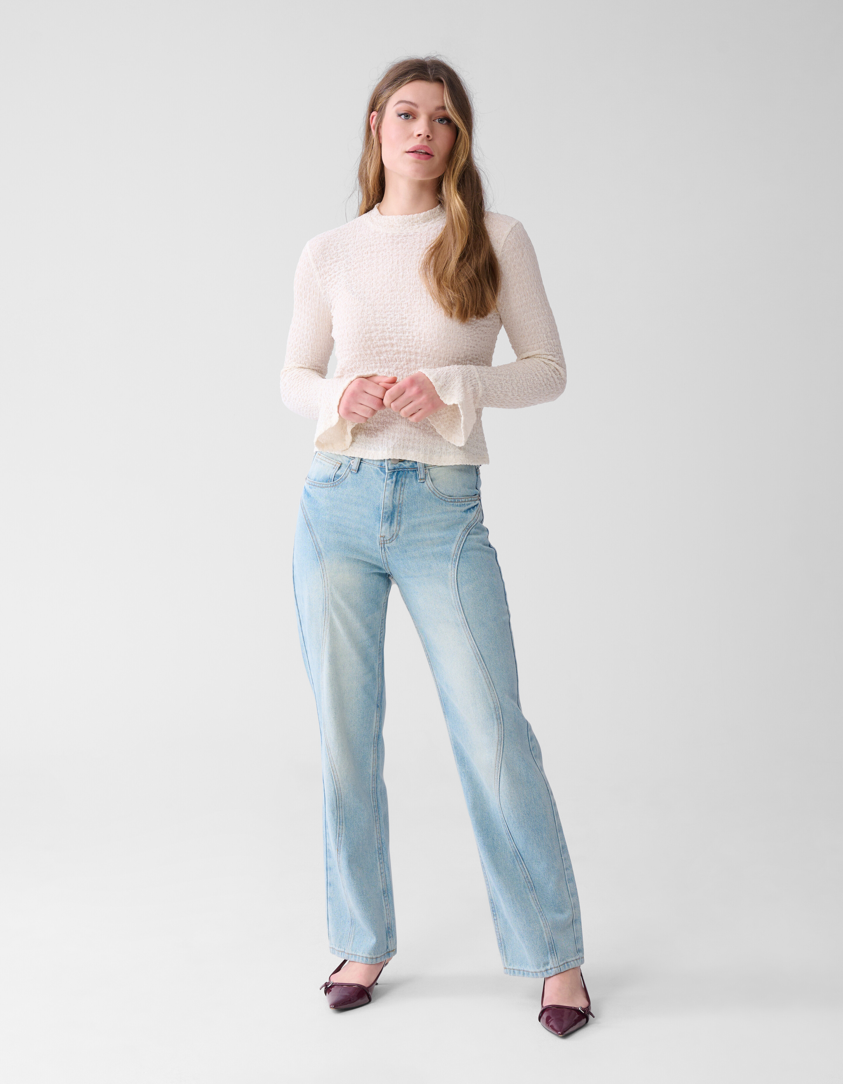 Entdecken Sie das Crinkle Top Off-white, perfekt für jede Gelegenheit. Das Oberteil hat einen Rundhalsausschnitt, lange Ärmel und einen dehnungsarmen Stoff. Außerdem zeichnet sich das Top durch seine cremefarbene Farbe und die Struktur im Oberteil aus. Das Oberteil ist aus Modal, Polyester und Elastan gefertigt. Das Model ist 176 cm groß und trägt Größe S. Der Artikel hat eine Gesamtlänge von 56 cm bei Größe S.