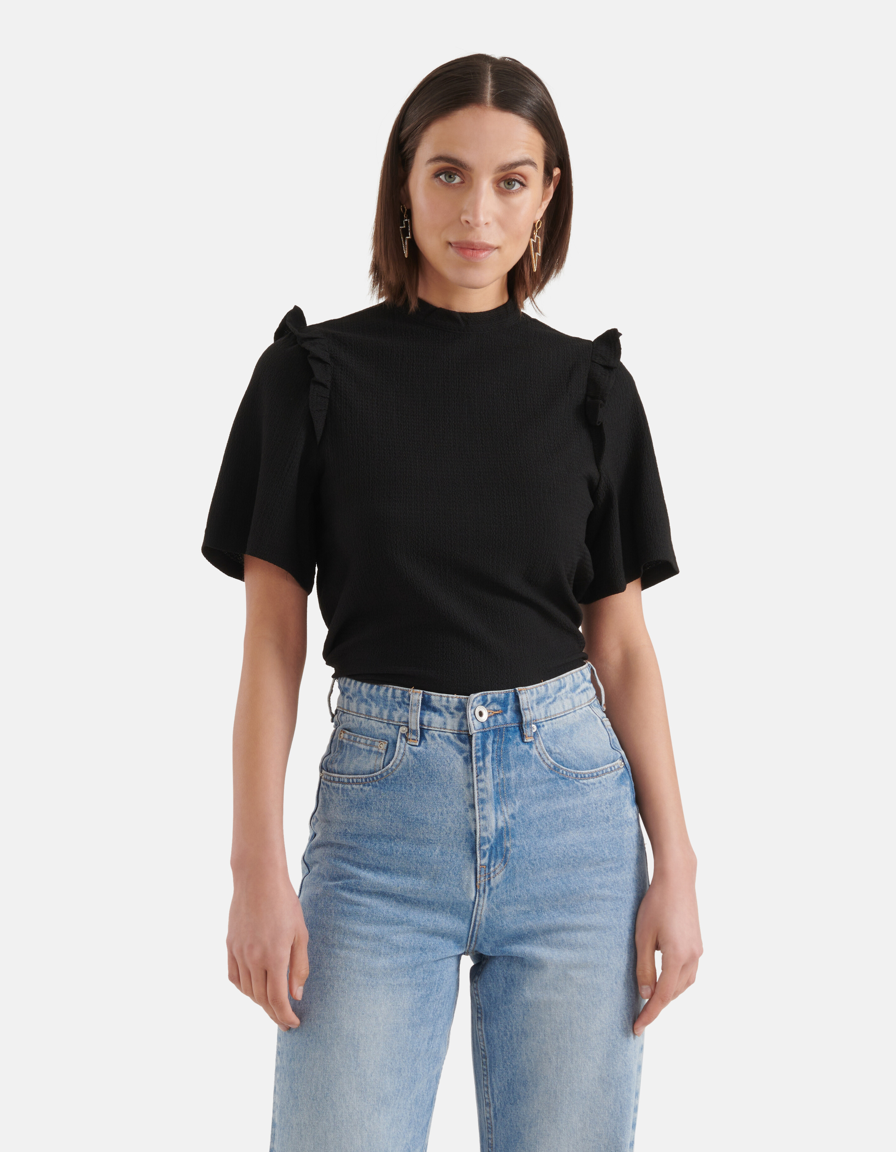 Perfekt in Schwarz! Das Crinkle Top hat kurze Ärmel, einen hohen Rundhalsausschnitt, einen Knopfverschluss auf der Rückseite und eine normale Passform. Der Artikel zeichnet sich durch die schwarze Farbe mit einer in den Stoff eingearbeiteten Crinkle-Struktur aus. Die Knitterstruktur verleiht dem Oberteil einen verspielten und knittrigen Effekt. Ein schönes Detail ist die Rüsche an den Schultern! Es ist aus Polyester und Elastan gefertigt. Durch diese Zusammensetzung ist es von hoher Qualität, dehnbar und sehr angenehm zu tragen. Vervollständigen Sie den Look mit einer Jeans mit weitem Bein und klobigen Turnschuhen! Das Model ist 178 cm groß und trägt Größe S. Der Artikel hat eine Gesamtlänge von 56,5 cm bei Größe S.