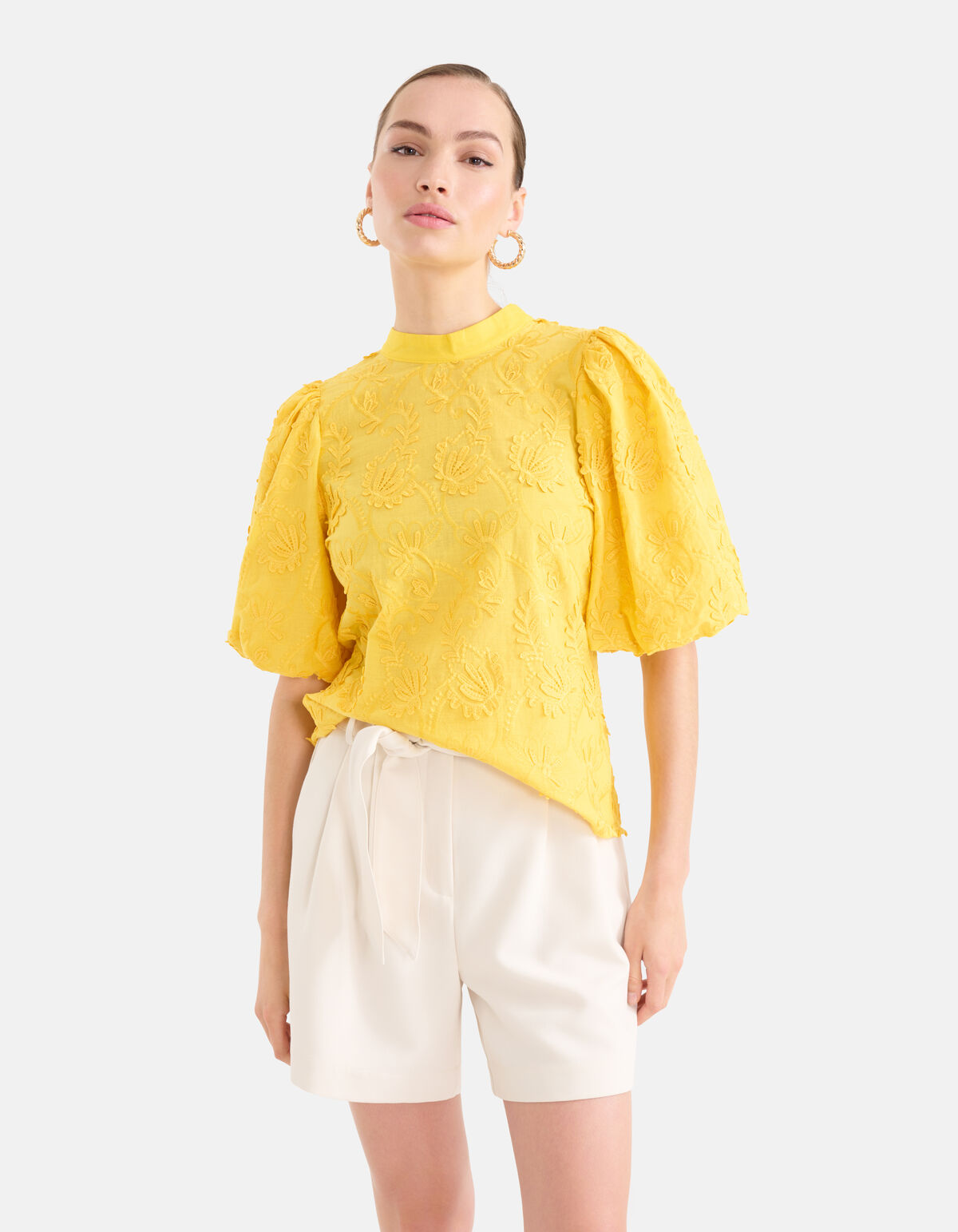 Shoeby bringt einen Hauch von Raffinesse in Ihre Garderobe! Das Embroidery Top hat kurze Puffärmel, einen hohen Rundhalsausschnitt, einen nicht dehnbaren Stoff, einen leicht transparenten Stoff, einen Knopfverschluss auf der Rückseite und eine normale Passform. Das Kleidungsstück zeichnet sich durch seine trendige gelbe Farbe mit einem Allover-Stickereidruck aus. Der Druck hat einen 3D-Effekt, der ihm eine einzigartige Wirkung verleiht. Ein schönes Detail ist das elastische Band am unteren Ende der Ärmel. Es besteht zu 100 % aus Baumwolle und ist daher von hoher Qualität und angenehm zu tragen. Kombinieren Sie es mit weißen Shorts und einem Paar Turnschuhen und Sie sind bereit, loszulegen! Das Model ist 173 cm groß und trägt Größe S. Der Artikel hat eine Gesamtlänge von 63 cm bei Größe S.