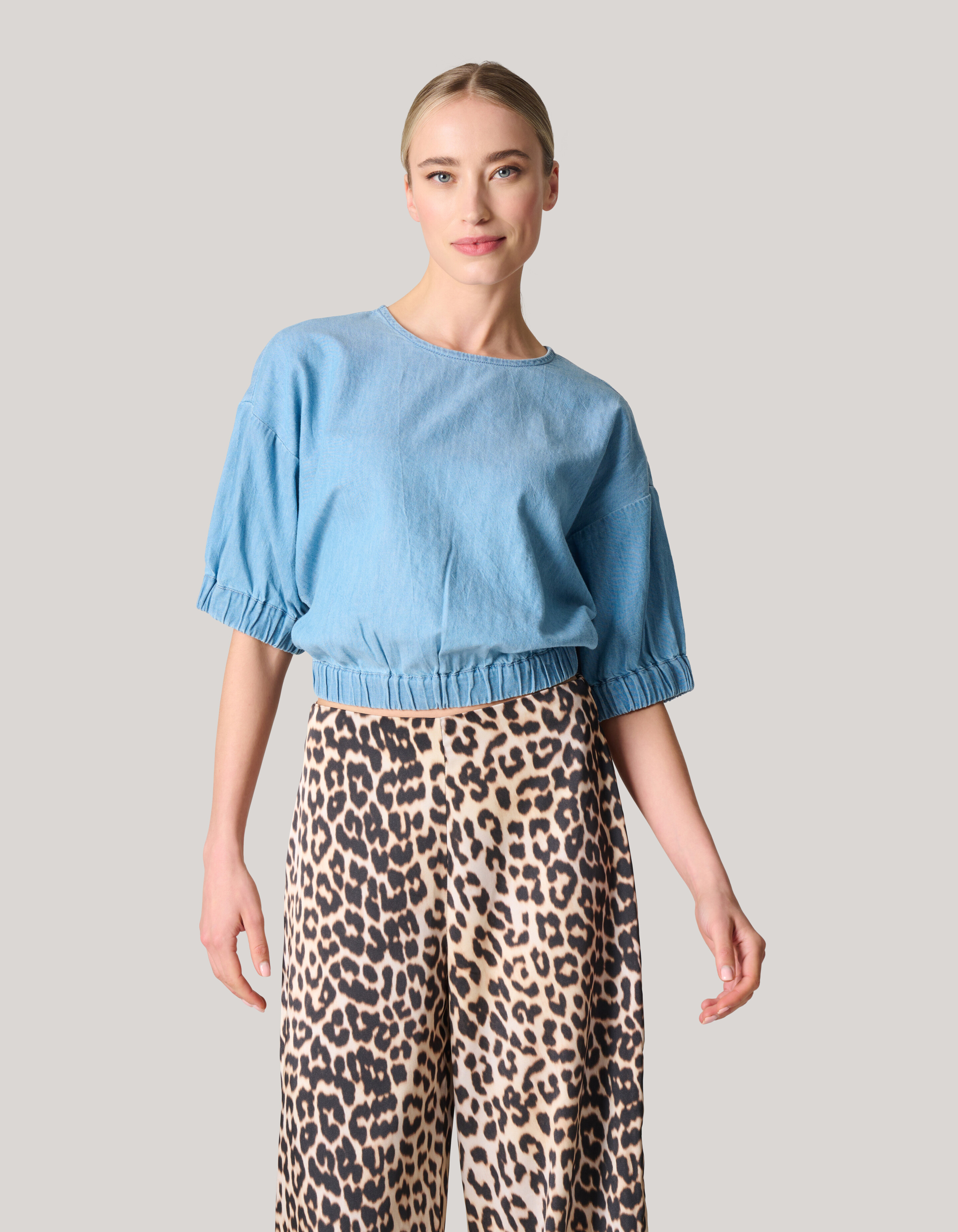 Machen Sie sich bereit für den Sommer! Das Denim Crop Top hat eine normale Passform, einen Rundhalsausschnitt und Dreiviertel-Puffärmel. Das Oberteil zeichnet sich durch die blaue Jeansfarbe aus. Darüber hinaus besteht es aus 100 % Baumwolle, was für ein angenehmes Tragegefühl sorgt.