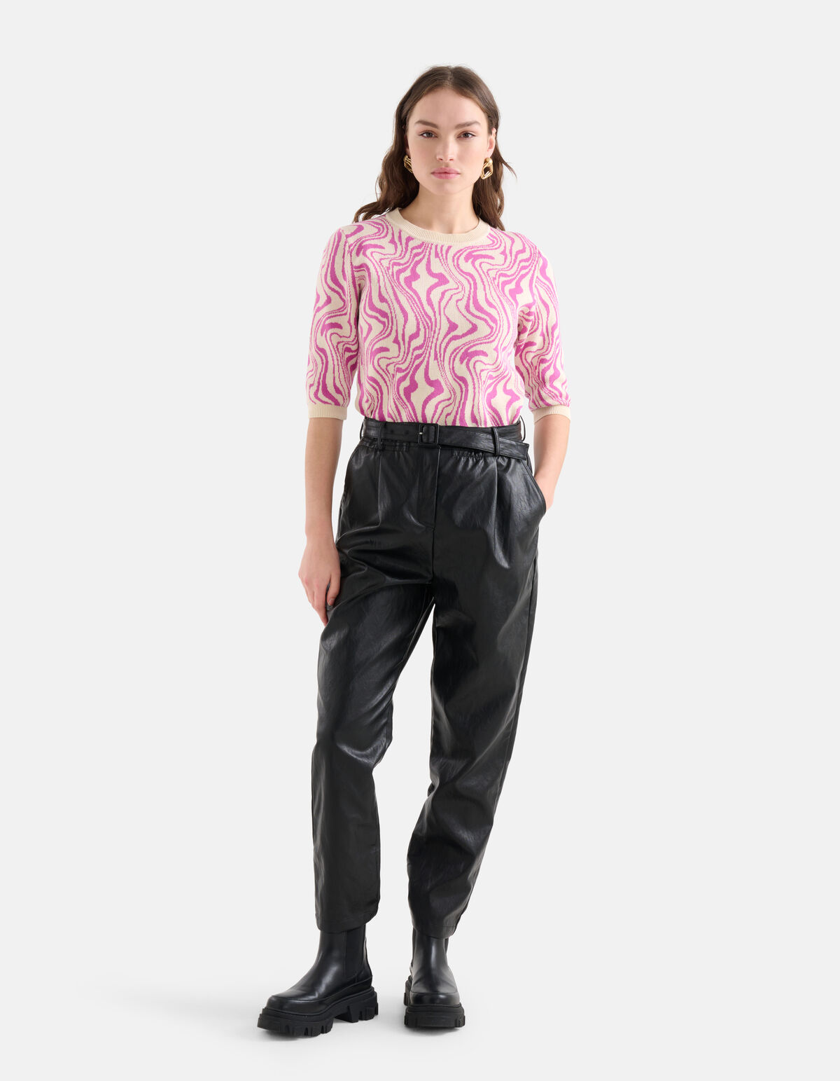 Farbe bekennen! Der Jacquard Swirl Pullover hat kurze Ärmel, einen hohen Rundhalsausschnitt und eine taillierte Passform. Das Kleidungsstück zeichnet sich durch seinen gestrickten, cremefarbenen Stoff mit einem Allover-Wirbeldruck in der Farbe Rosa aus. Der Jacquarddruck ist in den Stoff eingewebt und verleiht ihm einen luxuriösen Effekt. Es besteht aus 100 % Baumwolle und ist daher angenehm zu tragen und von hoher Qualität. Kombinieren Sie es mit einer veganen Lederhose und klobigen Stiefeln für einen ausgefallenen Look! Das Model ist 177 cm groß und trägt Größe S. Der Artikel hat eine Gesamtlänge von 51,5 cm bei Größe S.